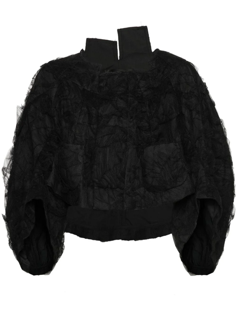 tulle-inserts cropped jacket Highlights - Black - Tulle inserts - Round neck - Drop shoulder - Three-quarter length sleeves - Two front patch pockets - Straight hem - Full lining - Front hook and eye fastening Made in Italy Composition Lining: Polyester 65%, Cotton 35% Outer: Nylon 100% SIZE & FIT Model measurements Height 5 ft 9 in(1.76 m) Bust/Chest 31.1 in(79 cm) Hips 36.61 in(93 cm) Waist 24.8 in(63 cm) FittingInformation Designed to be unstructured, offering a loose fit throughout Made from a lightweight non-stretch fabric This piece fits true to size – take your usual size Washing instructions Hand Wash