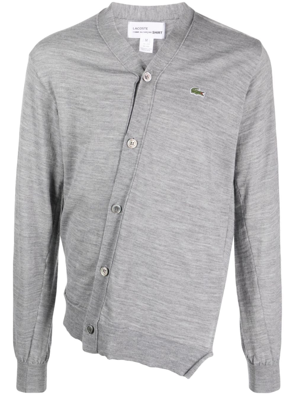 x Lacoste asymmetric wool cardigan Highlights - Grey - Wool - Knitted construction - Melange effect - Embroidered logo at the chest - V-neck - Drop shoulder - Asymmetric front button fastening - Long sleeves - Ribbed cuffs and hem - Asymmetric hem Imported Composition Wool 100% SIZE & FIT Model measurements Height 6 ft 0 in(1.84 m) Bust/Chest 35.82 in(91 cm) Hips 37 in(94 cm) Waist 28.34 in(72 cm) FittingInformation Designed for a slim fit, offering a comfortable fit that sits just away from the body Made with a midweight knit, this piece offers some stretch This piece fits true to size – take your usual size Washing instructions Dry Clean Only