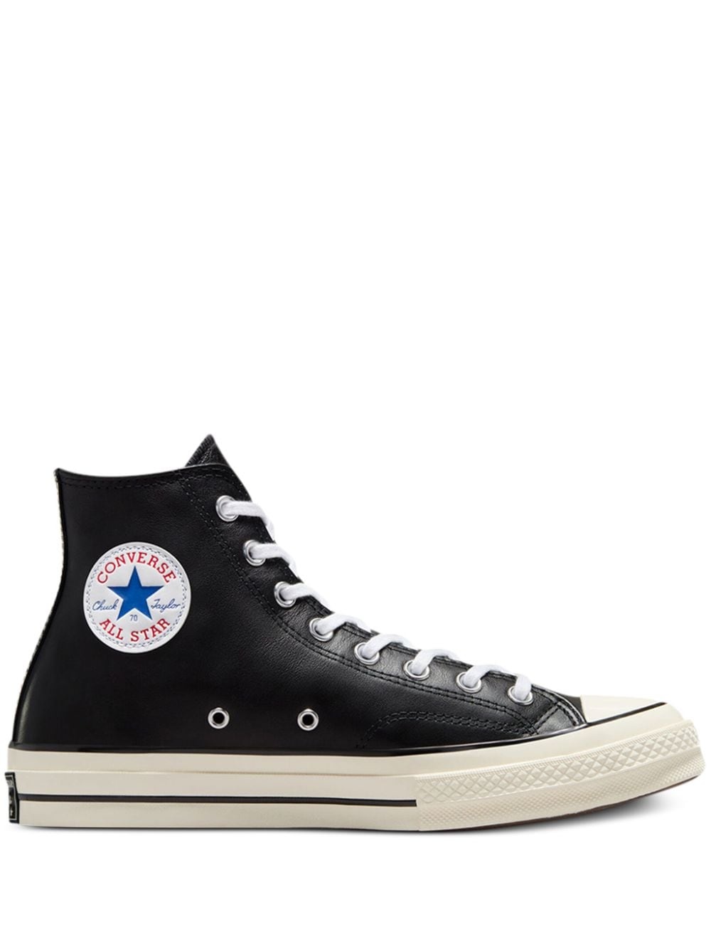 Chuck 70 Leather Hi "Black" sneakers Highlights - Black - Leather - Front lace-up fastening - Signature one star logo - Eyelet detailing - Rubber toecap - Rubber sole - These styles are supplied by a premium and authenticated sneaker marketplace. stocking only the most sought-after footwear, they source and curate some of the most hard to find sneakers from around the world. Imported Composition Leather 100% SIZE & FIT Measurement Sole height 0.98 in(2.5 cm)