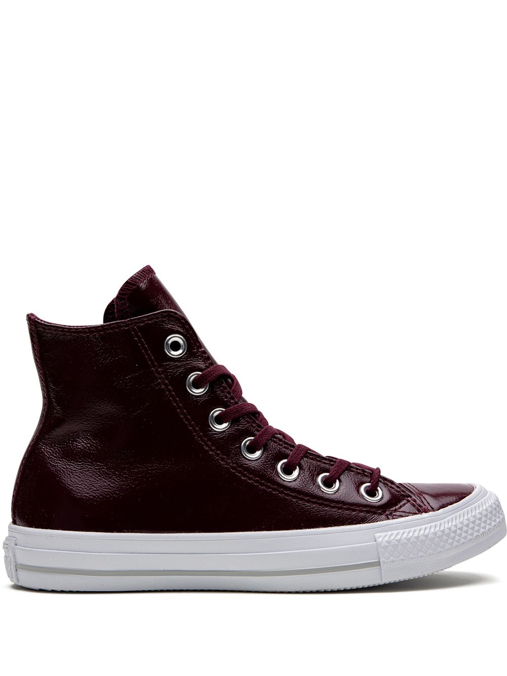 CTAS HI sneakers Celebrating the past while adding contemporary flair, the Converse Chuck Taylor All Star Crinkled Patent Leather Hi brings a twist to an icon for its June 2019 release. The recognisable high-top is decked out in an elegant, 'Dark Sangria' colour scheme giving the casual look an upgrade. Following suit, metallic silver eyelets decorate the vamp and give the midfoot some airflow on the medial side. A white rubber midsole lined with grey foxing tape combines with a waffle patterned outsole below. Imported Composition Sole: Rubber 100% Outer: Calf Leather 100% Lining: Polyester 100% SIZE & FIT Measurement HEIGHT 5.31 in(13.5 cm)
