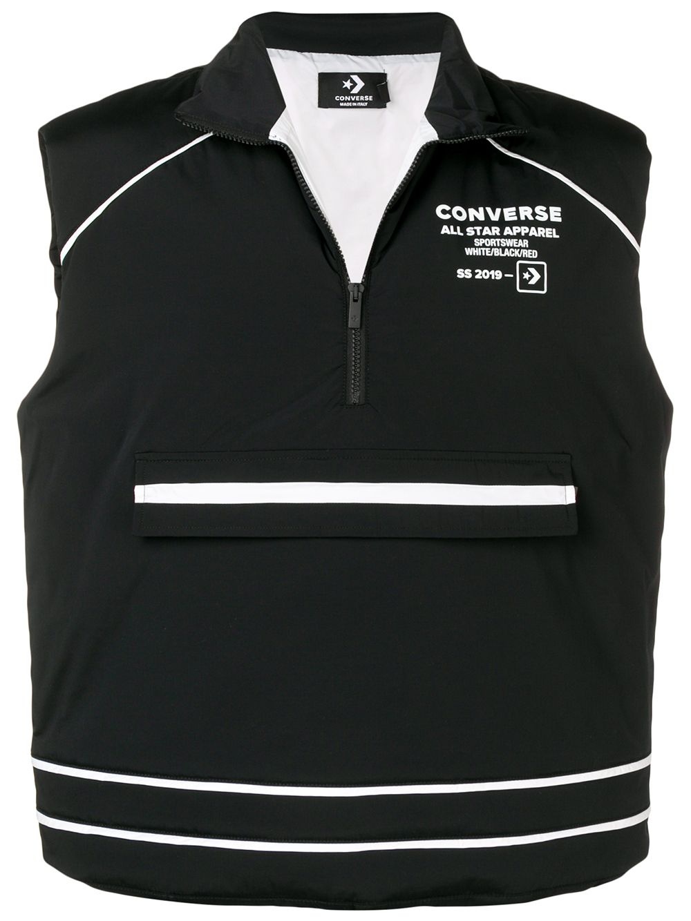 logo pullover gilet Black and white logo pullover gilet from Converse featuring a round neck, a front zip fastening, a sleeveless design, a logo to the chest, contrasting panels and a slim fit. Made in Italy Composition Lining: Polyester 100%, Nylon 100% Outer: Nylon 92%, Spandex/Elastane 8% SIZE & FIT Model measurements Height 6 ft 2 in(1.89 m) Bust/Chest 37.79 in(96 cm) Hips 37 in(94 cm) Waist 29.92 in(76 cm)