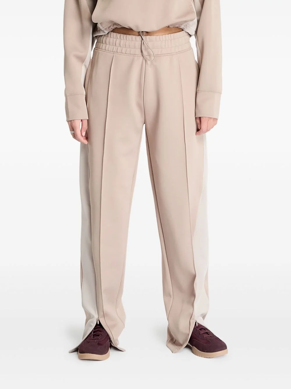 pleated track pants Highlights - Beige - Elasticated waistband - Side stripes - Pleat detail - Embroidered logo - Slanted pockets Imported Composition Polyester 97%, Elastane 3%