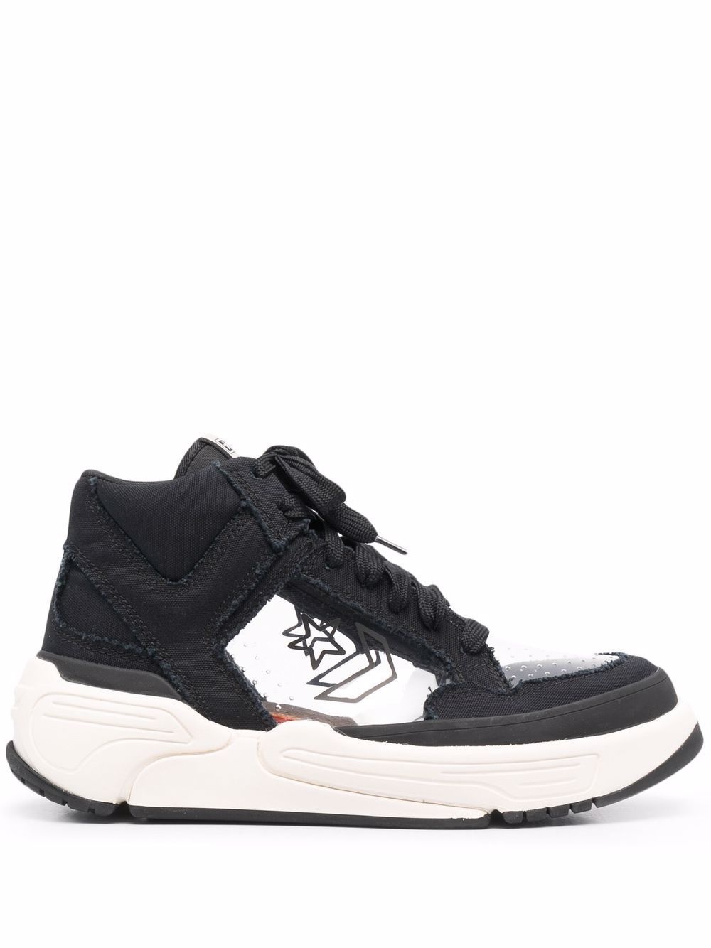 Weapon CX "Joshua Vides Black Clear" Highlights - Black clear rutabaga - Leather/cotton - Canvas - Transparent design - Perforated detailing - Star print - Logo patch at the tongue - Front lace-up fastening - Round toe - Chunky rubber sole - Interchangeable laces Imported Composition Cotton 100% SIZE & FIT Measurement HEEL 1.96 in(5 cm) Sole height 1.18 in(3 cm)
