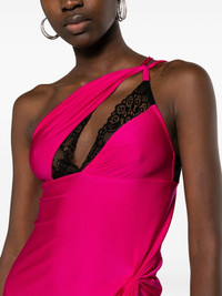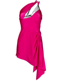 asymmetric mini dress Experimental pieces like this fuchsia minidress are a key element of Coperni's design DNA. It’s defined by its asymmetry – the asymmetric neck is designed to look as though the shoulder straps are pulled to one side to form the lace-trimmed cut-out while the skirt is gathered to create angular drape at the hem. Highlights - Fuchsia pink - Stretch-jersey - Cut-out detailing - Lace trim - Gathered detailing - Draped panel detail - Asymmetric neck - One-shoulder - Adjustable strap to the rear - Asymmetric hem - Thigh-length Made in Italy Composition Nylon 100%, Polyamide 80%, Elastane 20% SIZE & FIT Model measurements Height 5 ft 11 in(1.8 m) Bust/Chest 32.67 in(83 cm) Hips 36.22 in(92 cm) Waist 24.4 in(62 cm) Measurement HIPS 39.37 in(100 cm) LENGTH 40.15 in(102 cm) WAIST 30.7 in(78 cm) FittingInformation Designed for a close fit at the chest and waist with a loose fit at the hip The adjustable shoulder straps allow for a preferred fit when worn Made from a midweight stretch fabric, this piece offers elasticity and flexibility when worn This piece fits true to size – take your usual size Washing instructions Hand Wash