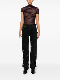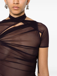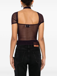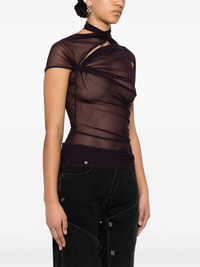asymmetric draped mesh top Highlights - Dark purple - Stretch-design - Mesh design - Sheer - Asymmetric design - Draped detailing - V-neck - Sleeveless - Knot detailing - Silver-tone logo plaque - Asymmetric hem Made in Italy Composition Polyamide 92%, Elastane 8% SIZE & FIT Model measurements Height 5 ft 10 in(1.77 m) Bust/Chest 31.88 in(81 cm) Hips 36.22 in(92 cm) Waist 24.01 in(61 cm) Measurement LENGTH 15.74 in(40 cm) BUST 28.34 in(72 cm) FittingInformation Designed for a close fit throughout Made from a lightweight stretch fabric, this piece offers elasticity and flexibility when worn This piece fits true to size – take your usual size