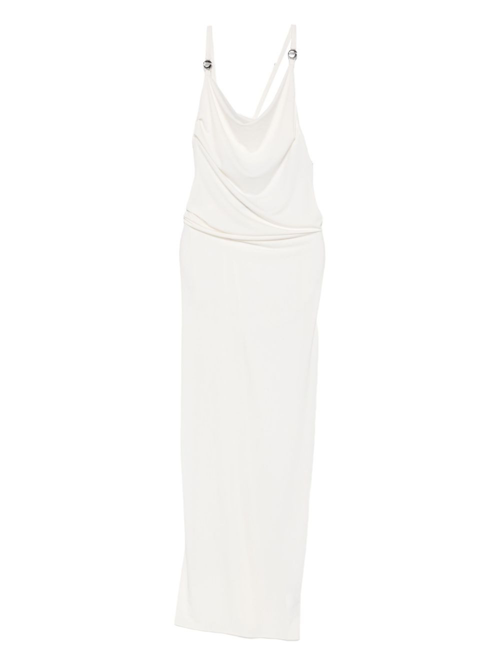 cowl-neck strap dress Highlights - White - Cowl neck - Straps - Fitted - Midi length - Metal ring details Made in Italy Composition Polyester 95%, Elastane 5% SIZE & FIT Model measurements Height 5 ft 9 in(1.75 m) Bust/Chest 32.67 in(83 cm) Hips 36.22 in(92 cm) Waist 24.8 in(63 cm) Washing instructions Hand Wash