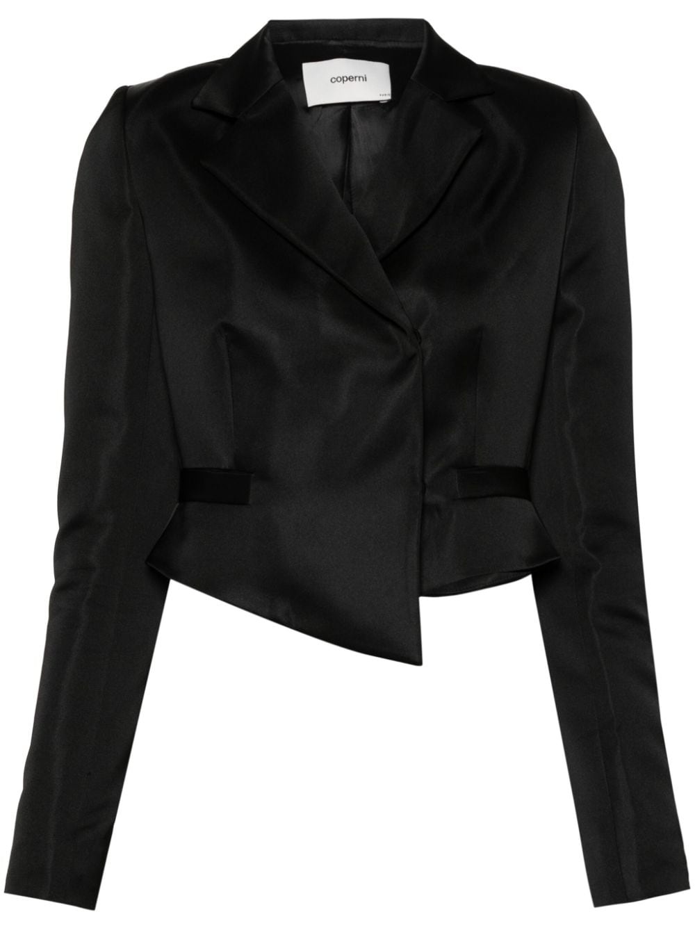cropped double-breasted blazer A prime example of Coperni's exploratory aesthetic, this satin cropped blazer is crafted in an asymmetric silhouette that revitalises classic tailoring. It features a concealed double-breasted fastening, with an open hem that creates a slightly sculpting effect. Highlights - Black - Satin finish - Notched lapels - Long sleeves - Dart detailing - Two side welt pockets - Full lining - Asymmetric hem - Off-centre front button fastening - Press-stud fastening - Off-centre double- press-stud fastening Made in France Composition Lining: Viscose 100% Outer: Polyester 100% SIZE & FIT Model measurements Height 5 ft 11 in(1.8 m) Bust/Chest 32.67 in(83 cm) Hips 36.22 in(92 cm) Waist 24.4 in(62 cm) FittingInformation Designed for a slim fit that sits just away from the body offering a close yet comfortable fit The internal shoulder pads offer a structured shape Made from a midweight non-stretch fabric This piece fits true to size – take your usual size Washing instructions Dry Clean Only