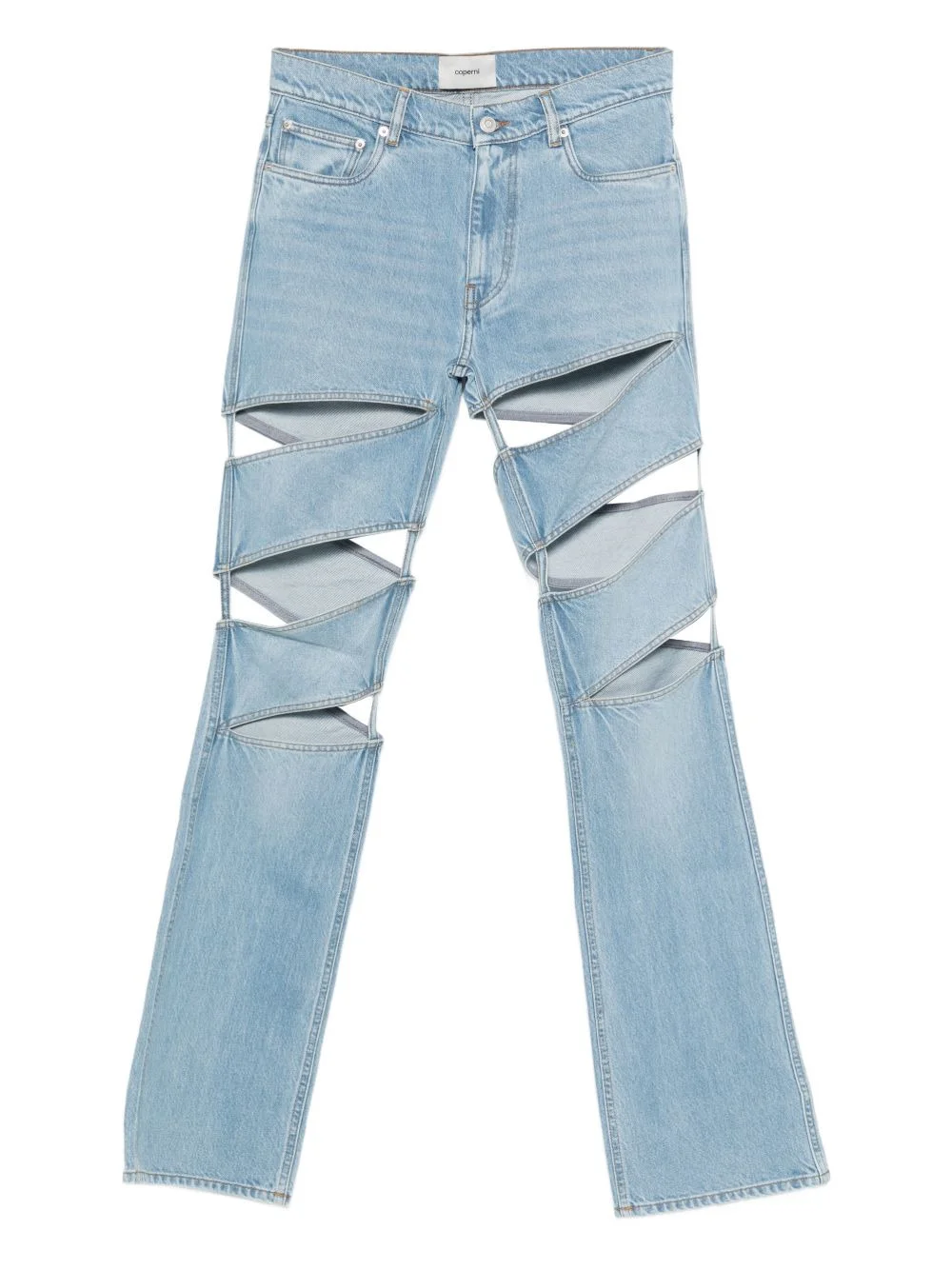 cut-out jeans Highlights - Light blue - Cut-out design - Five pockets - Belt loops Imported Composition Outer: Organic Cotton 100% Lining: Cotton 50%, Polyester 50% Washing instructions Machine Wash