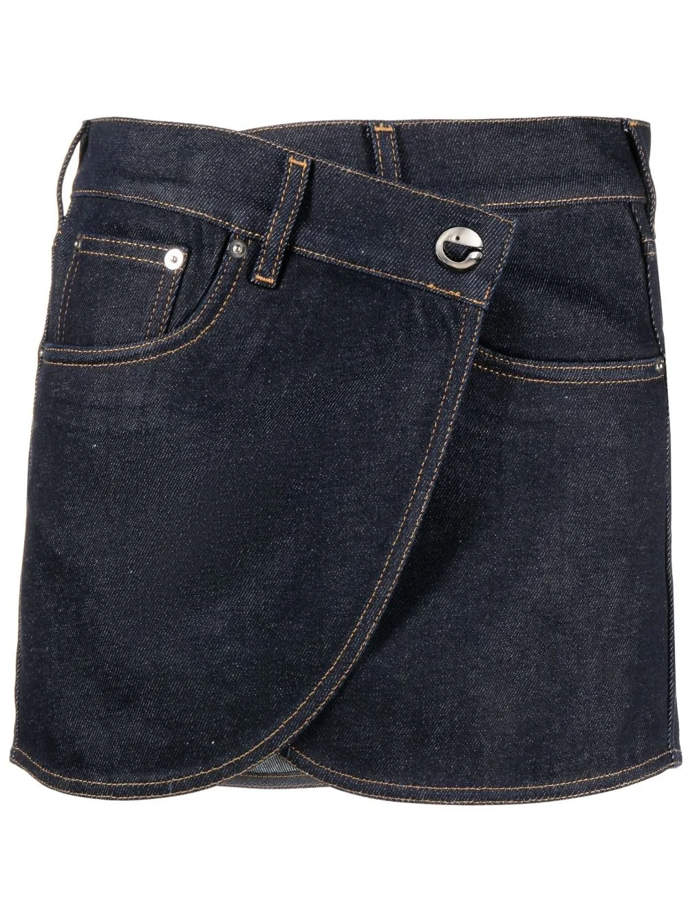 denim wrap miniskirt Coperni is all about unexpected silhouettes and standout detailing, as seen with this miniskirt. It's cut to an asymmetric wrap design that puts the label's logo – in the form of a button – front and centre. Highlights - Navy blue - Cotton - Denim - Contrast stitching - Wrap design - Off-centre front button fastening - Belt loops - Classic five pockets - Logo patch to the rear - Thigh-length - Asymmetric hem Made in Italy Composition Outer: Cotton 100% Lining: Polyester 65%, Cotton 35% SIZE & FIT Model measurements Height 5 ft 10 in(1.77 m) Bust/Chest 27.95 in(71 cm) Hips 33.85 in(86 cm) Waist 23.22 in(59 cm) FittingInformation This mini-length skirt is intended to be worn just below the waist Sturdy and hard-wearing, this denim piece offers no stretch This piece fits true to size – take your usual size