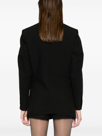 double-breasted blazer Highlights - Black - Recycled polyester - Satin trim - Peak lapels - Shoulder pads - Long sleeves - Buttoned cuffs - Two side flap pockets - Full lining - Double-breasted button fastening Made in France Composition Outer: Recycled Polyester 100% Lining: Viscose 100% SIZE & FIT Model measurements Height 5 ft 11 in(1.8 m) Bust/Chest 31.49 in(80 cm) Hips 36.22 in(92 cm) Waist 25.59 in(65 cm) FittingInformation Designed to be unstructured, offering a loose fit throughout The internal shoulder pads offer a structured shape Made from a midweight non-stretch fabric This piece fits true to size – take your usual size