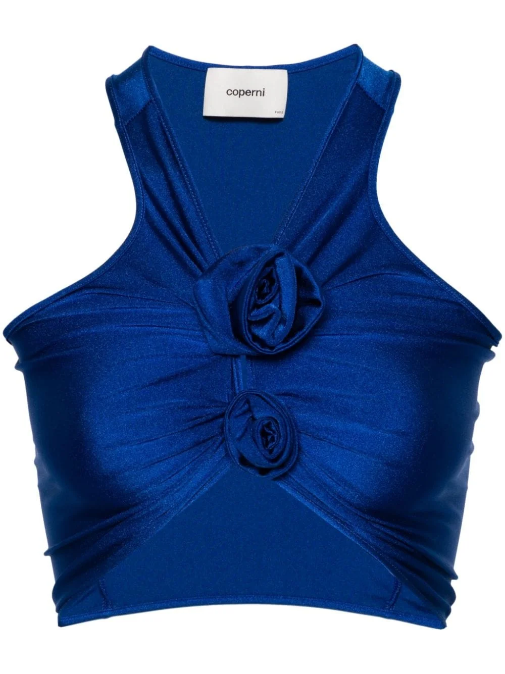 floral-applique cropped top Highlights - Blue - Stretch-design - Floral applique - Sleeveless - Gathered detailing - Elasticated hem - Cropped Made in France Composition Polyamide 80%, Spandex/Elastane 20% SIZE & FIT Measurement BUST 29.13 in(74 cm) LENGTH 13.38 in(34 cm) Washing instructions Machine Wash