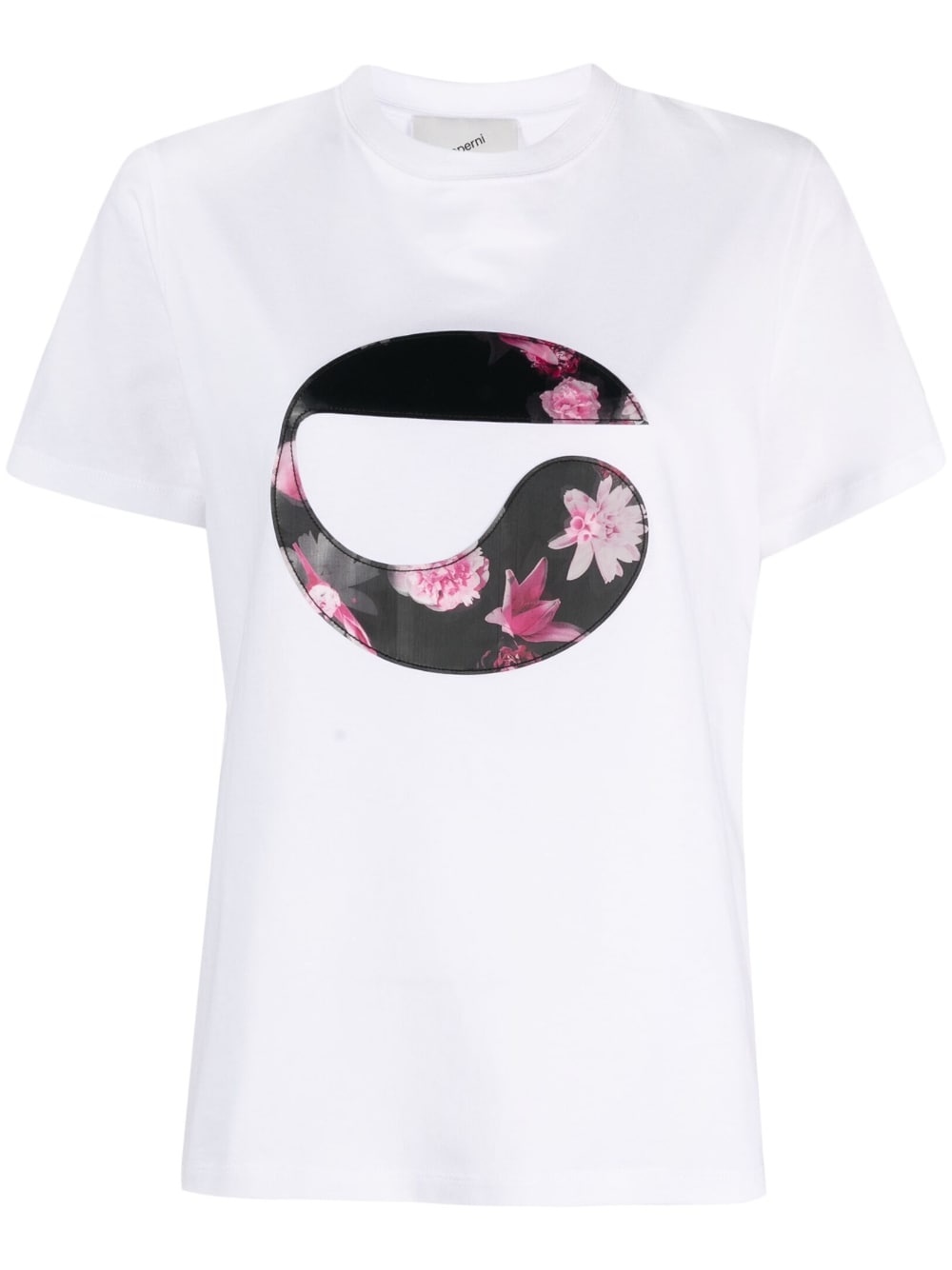floral logo-patch T-shirt Highlights - Optical white - Cotton - Logo patch to the front - Floral print - Crew neck - Short sleeves - Straight hem Imported Composition Cotton 100%, Polyurethane 60%, PVC 40% SIZE & FIT Model measurements Height 5 ft 11 in(1.8 m) Bust/Chest 31.49 in(80 cm) Hips 35.82 in(91 cm) Waist 24.8 in(63 cm) FittingInformation Designed for a boxy fit, intended for a loose fit throughout Made from a midweight non-stretch fabric, this piece offers minimal elasticity when worn This piece fits true to size – take your usual size Washing instructions Hand Wash