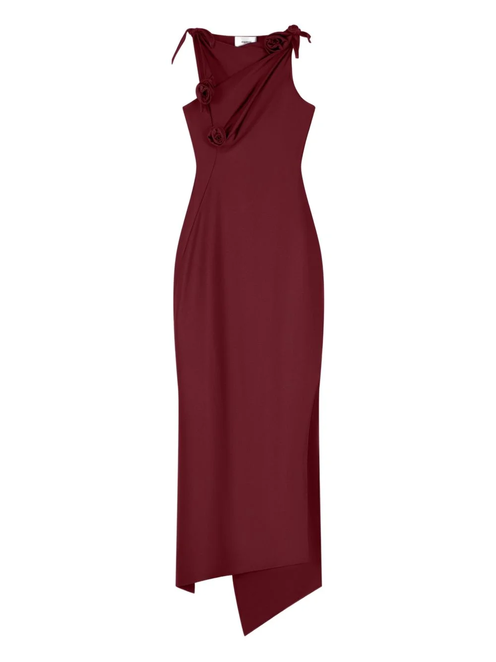 Flower embellished asymmetric gown Highlights - Red - Asymmetric design - Rosette details - Sleeveless - Side slit - Gathered fabric detail Made in France Composition Polyamide 80%, Elastane 20% Washing instructions Read Manufacturer Guidelines