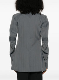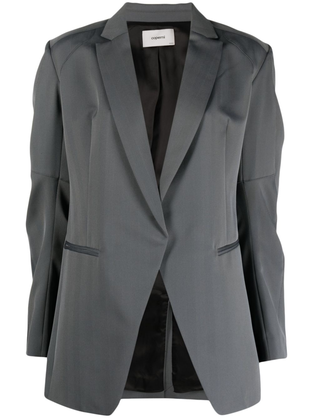 herringbone-pattern biker blazer Coperni puts a twist on classic tailoring with this grey blazer. Made from recycled polyester for a lower environmental impact, it boasts a sleek silhouette adorned with quilted elbow patches, drawing inspiration from biker styles to evoke a simultaneously refined and rebellious look. Highlights - Medium grey - Recycled polyester - Herringbone pattern - Notched lapels - Concealed front fastening - Long sleeves - Elbow patches - Two front jetted pockets - Central rear vent - Straight hem Imported Composition Lining: Polyester 70%, Polyurethane 30% Outer: Recycled Polyester 100% SIZE & FIT Model measurements Height 5 ft 10 in(1.78 m) Bust/Chest 33.07 in(84 cm) Hips 36.61 in(93 cm) Waist 24.8 in(63 cm) FittingInformation Designed for a slim fit that sits just away from the body offering a close yet comfortable fit The internal shoulder pads offer a structured shape Made from a midweight non-stretch fabric This piece fits true to size – take your usual size Washing instructions Dry Clean Only