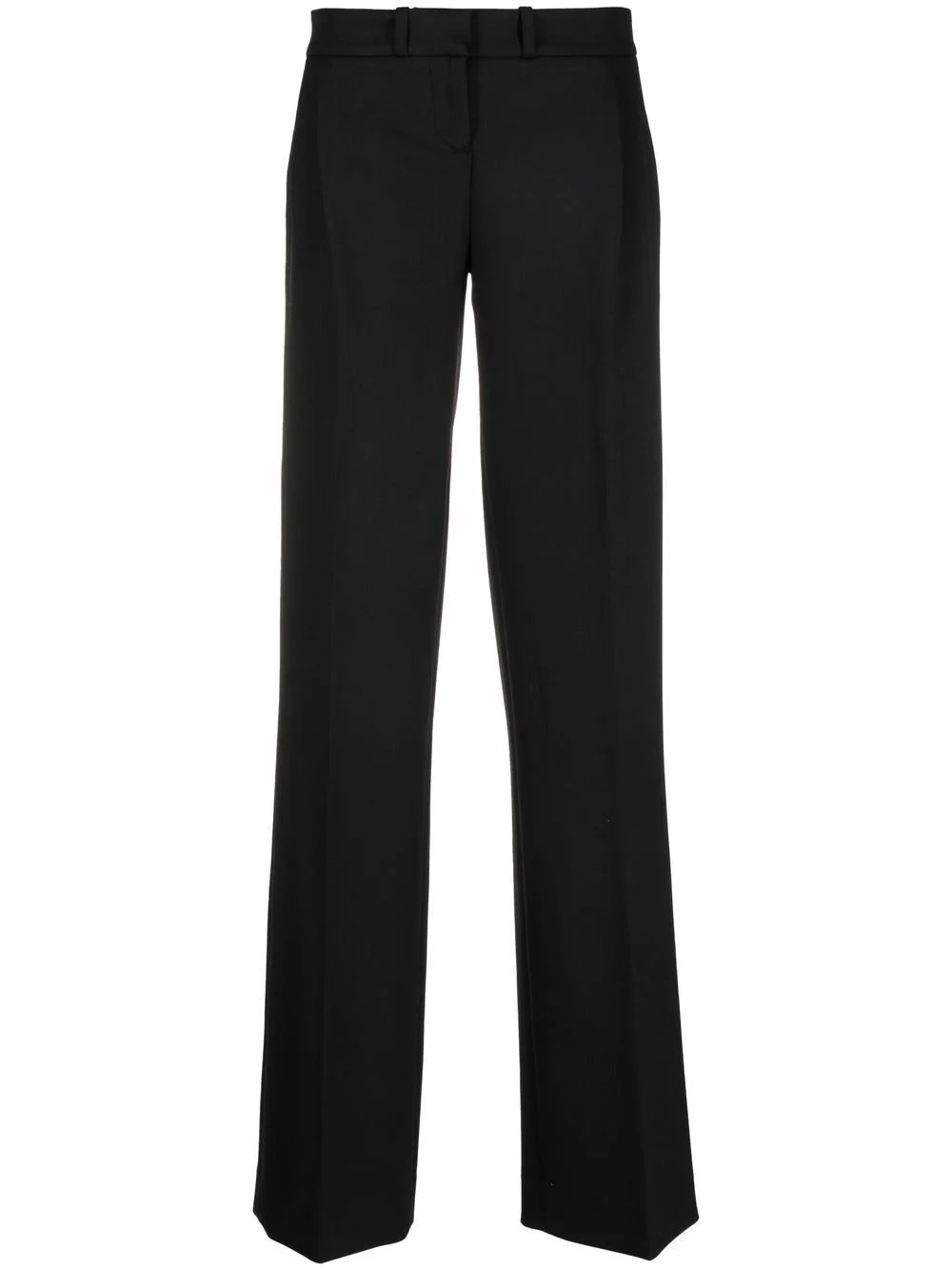 high-waist straight-leg trousers black tailored design high-waisted straight leg pressed crease concealed front fastening belt loops two diagonal pockets to the sides two rear button-fastening pockets Imported Composition Polyester 64%, Viscose 34%, Spandex/Elastane 2% SIZE & FIT Model measurements Height 5 ft 10 in(1.79 m) Bust/Chest 33.07 in(84 cm) Hips 35.82 in(91 cm) Waist 24.01 in(61 cm) FittingInformation This piece fits true to size. We recommend you get your regular size Designed to be fitted at the waist and hips, loose over the leg Made with a mid-weight stretch fabric Washing instructions Dry Clean Only