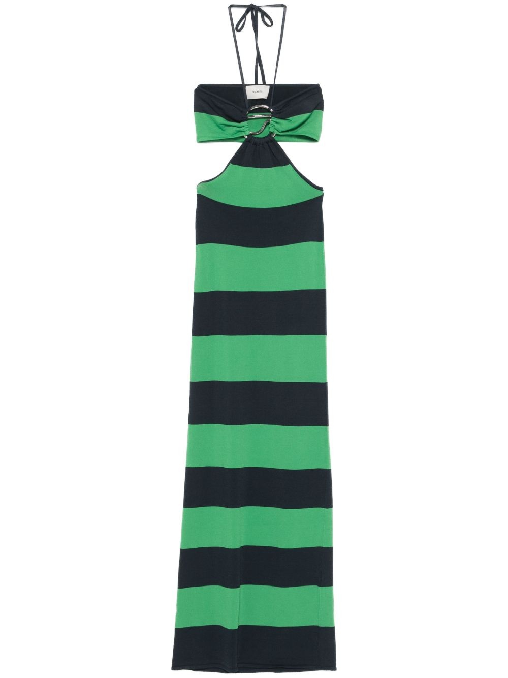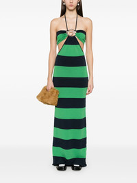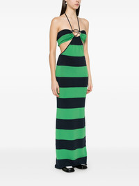knitted striped midi dress Highlights - Green - Halterneck tie fastening - Silver-tone logo plaque - Open back Made in Italy Composition Viscose 88%, Polyester 12% SIZE & FIT Model measurements Height 5 ft 10 in(1.78 m) Bust/Chest 33.85 in(86 cm) Hips 36.61 in(93 cm) Waist 26.77 in(68 cm) FittingInformation Designed for a close fit throughout Made with a midweight knit, this piece offers some stretch