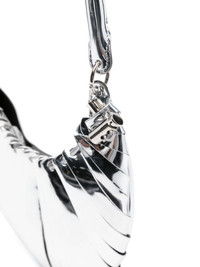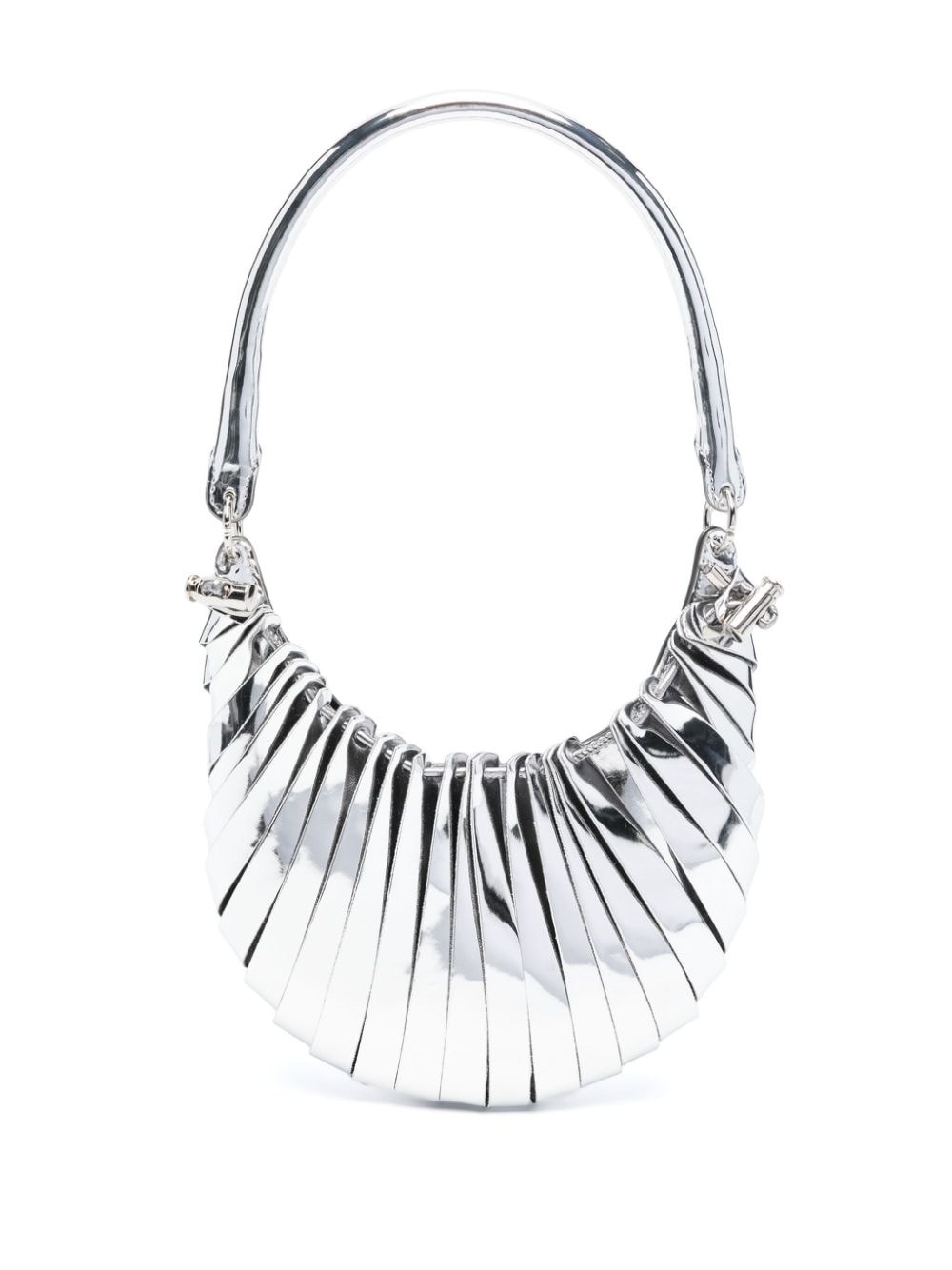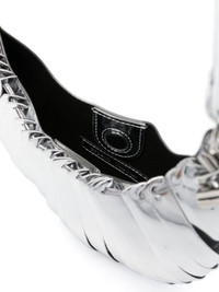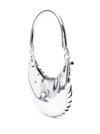 Mini Petal metallic shoulder bag Coperni’s ‘minimalist and architectural’ silver Mini Petal bag takes its title and inspirations from the namesake floral leaves. The front comprises individual strips of metallic faux leather intricately strung along a drawstring – the pliable crescent silhouette can be adjusted with side toggles. Highlights - Silver-tone - Faux leather - Metallic finish - Elasticated toggle detailing - Concealed magnetic fastening - Single shoulder strap - Main compartment - Internal logo patch Made in Italy Composition Outer: Polyurethane 75%, Polyester 20%, Viscose 5% Lining: Polyurethane 80%, Polyester 20% SIZE & FIT Model measurements Height 5 ft 10 in(1.78 m) Bust/Chest 32.67 in(83 cm) Hips 35.43 in(90 cm) Waist 23.22 in(59 cm) Measurement DEPTH 1.57 in(4 cm) HEIGHT 7.48 in(19 cm) STRAP 8.26 in(21 cm) WIDTH 7.87 in(20 cm)