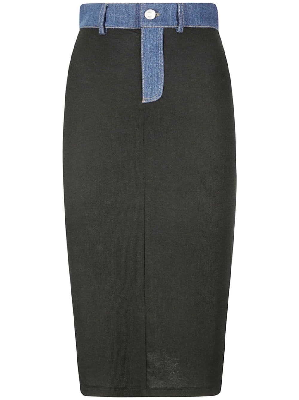 ribbed denim-trimmed skirt Highlights - Black/blue - Lyocell blend/cotton - Stretch-jersey - Fine ribbed - Silver-tone logo plaque - Denim trim - Panelled design - Belt loops - Concealed fly and button fastening - Two rear patch pockets - Straight hem - Below-knee length Imported Composition Outer: Lyocell 64%, Cotton 31%, Elastane 5% Lining: Cotton 100% Washing instructions Read Manufacturer Guidelines