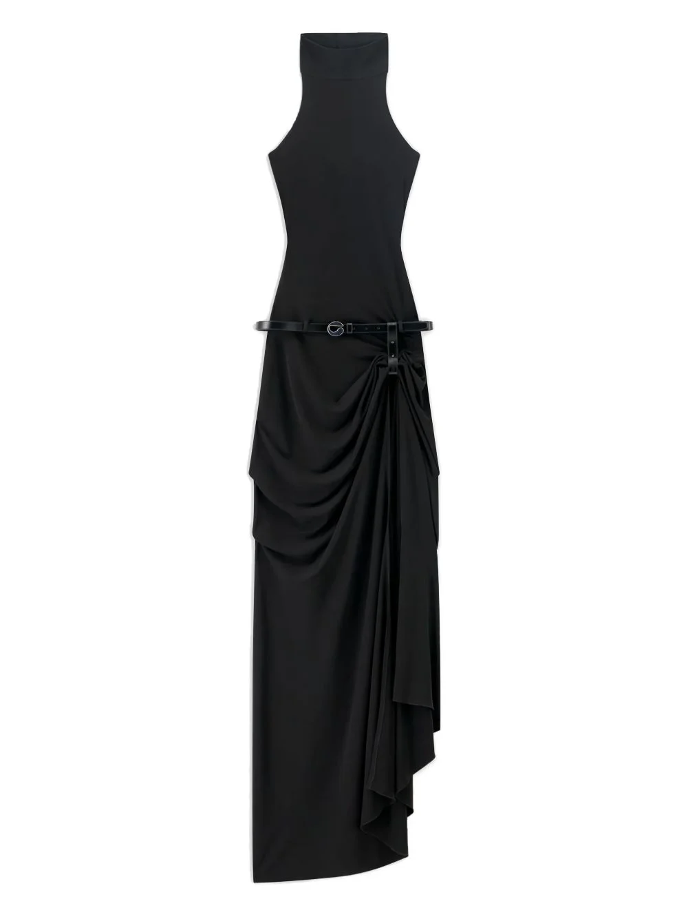 sleeveless maxi dress Highlights - Black - Belted waist - Sleeveless - Draped detail Made in France Composition Polyester 95%, Elastane 5% Washing instructions Read Manufacturer Guidelines