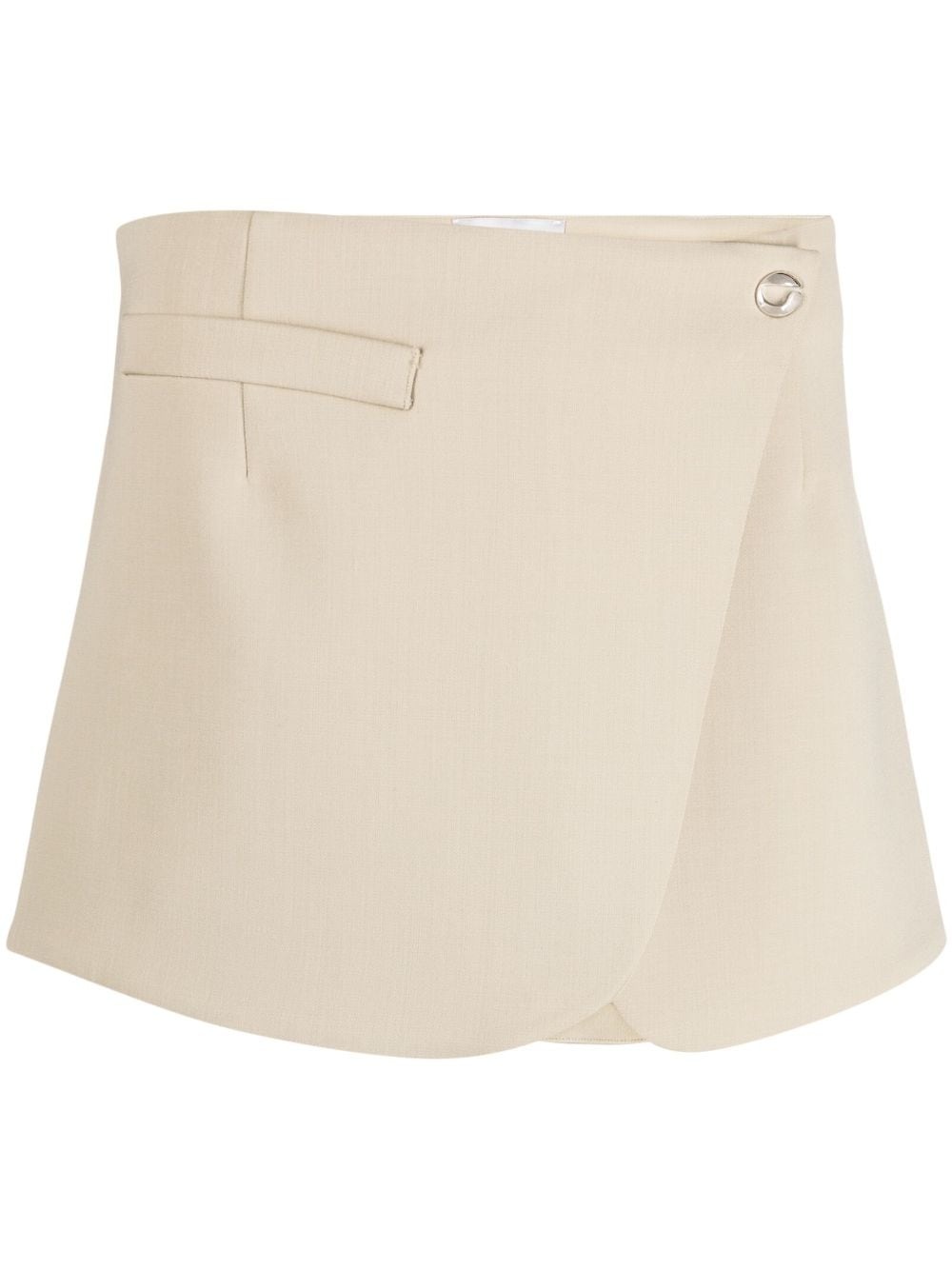 tailored wrap miniskirt A C-shaped silver-tone button elevates the all-beige design of this tailored miniskirt, evocative of Coperni's daring approach to classic silhouettes. Its wrap design creates a curved hem and high-cut slit at the front. Highlights - Beige - Mid-rise - Wrap design - Front button fastening - Front welt pocket - Front slit - Curved hem - Thigh-length Imported Composition Outer: Recycled Polyester 49%, Viscose 34%, Polyester 15%, Elastane 2% Lining: Viscose 52%, Cupro 48% SIZE & FIT Model measurements Height 5 ft 10 in(1.78 m) Bust/Chest 29.92 in(76 cm) Hips 34.64 in(88 cm) Waist 23.62 in(60 cm) FittingInformation This mini-length skirt is intended to be worn low on the hips Slightly short in length; consider your own measurements Made from a midweight fabric This piece fits true to size – take your usual size Washing instructions Dry Clean Only