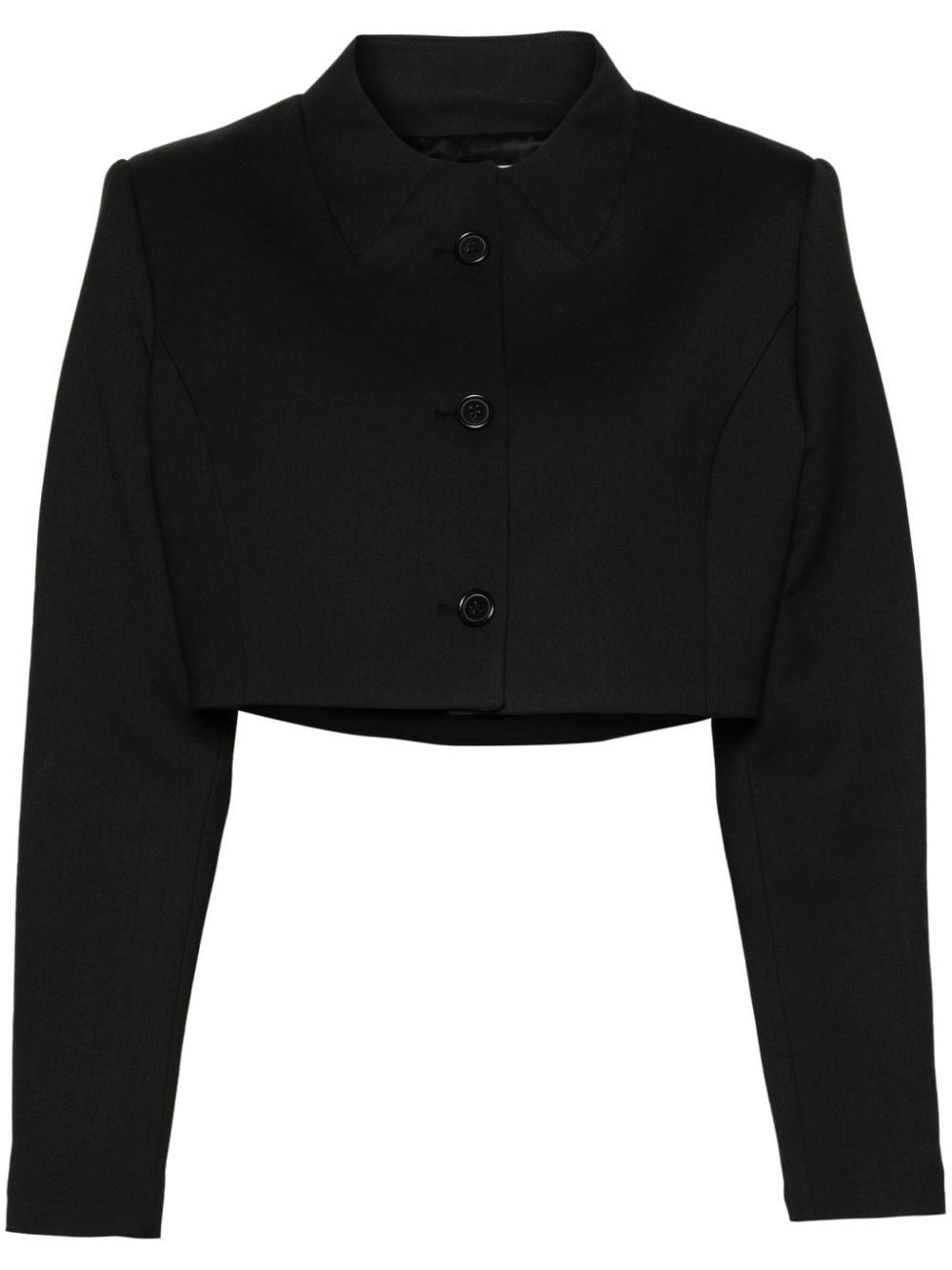 twill cropped jacket Sharp and edgy, this black cropped jacket encapsulates Coperni's singular aesthetic. It's tailored from partially recycled twill, boasting structured shoulders and a shortened pointed collar. Highlights - Black - Twill weave - Faux pointed flat collar - Shoulder pads - Long sleeves - Straight hem - Cropped - Full lining - Front button fastening Imported Composition Outer: Recycled Polyester 49%, Viscose 34%, Polyester 15%, Elastane 2% Lining: Viscose 52%, Cupro 48% SIZE & FIT Model measurements Height 5 ft 11 in(1.8 m) Bust/Chest 32.67 in(83 cm) Hips 36.22 in(92 cm) Waist 24.4 in(62 cm)