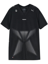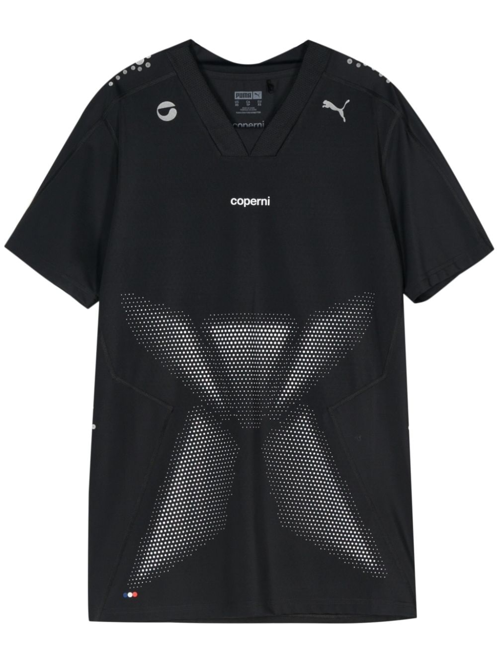 x Puma logo-print T-shirt Highlights - Black - Technical jersey - V-neck - Logo print at the chest - Glitter detailing - Perforated detailing - Short sleeves - Straight hem - When buying this unisex item, keep in mind that it is graded in standard men's sizing. Imported Composition Nylon 78%, Elastane 22% Washing instructions Machine Wash