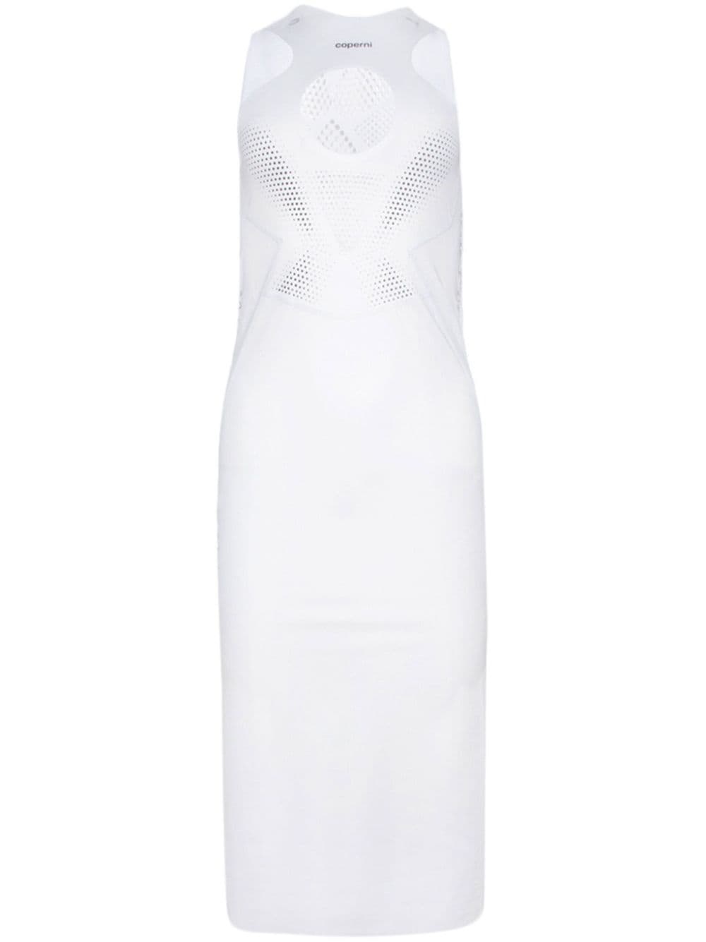 x PUMA midi dress Highlights - White - Recycled nylon blend - Cut-out detailing - Perforated detailing - Logo print to the front - Halterneck - Sleeveless - Mid-length Imported Composition Other fibres 100% SIZE & FIT FittingInformation Designed for a close fit throughout Made from a midweight stretch fabric, this piece offers elasticity and flexibility when worn This piece fits true to size – take your usual size