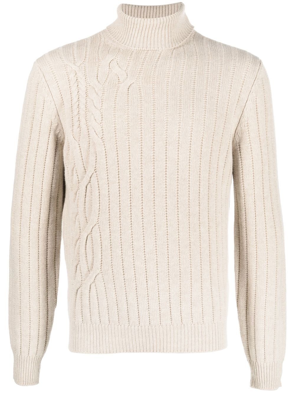 cable-knit roll-neck jumper light beige virgin wool-cashmere blend cable knit ribbed detailing roll neck long sleeves straight hem Made in Italy Composition Virgin Wool 75%, Silk 15%, Cashmere 10% SIZE & FIT Model measurements Height 6 ft 1 in(1.85 m) Bust/Chest 35.82 in(91 cm) Hips 37.79 in(96 cm) Waist 29.13 in(74 cm) FittingInformation This piece fits true to size. We recommend you get your regular size Cut for a relaxed fit Made with a mid-weight fabric Washing instructions Hand Wash