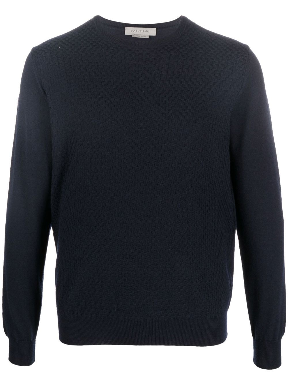 crew-neck long-sleeve jumper navy blue virgin wool fine knit basket weave pattern crew neck long sleeves straight hem Made in Italy Composition Virgin Wool 100% SIZE & FIT Model measurements Height 6 ft 1 in(1.85 m) Bust/Chest 35.82 in(91 cm) Hips 37.79 in(96 cm) Waist 29.13 in(74 cm) Washing instructions Machine Wash