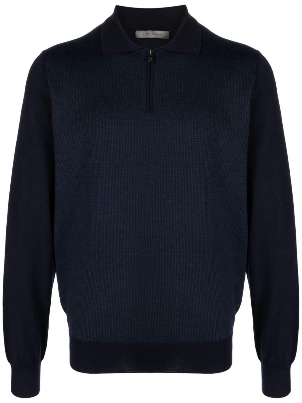 fine-knit wool polo shirt Highlights - Navy blue - Virgin wool - Fine knit - Fine check pattern - Polo collar - Short front zip fastening - Long sleeves - Ribbed cuffs and hem - Straight hem Made in Italy Composition Virgin Wool 100% SIZE & FIT Model measurements Height 6 ft 2 in(1.88 m) Bust/Chest 35.03 in(89 cm) Hips 35.82 in(91 cm) Waist 27.95 in(71 cm) FittingInformation Designed for a relaxed fit, this polo shirt offers comfort and movement Made with a midweight knit, this piece offers some stretch This piece fits true to size – take your usual size