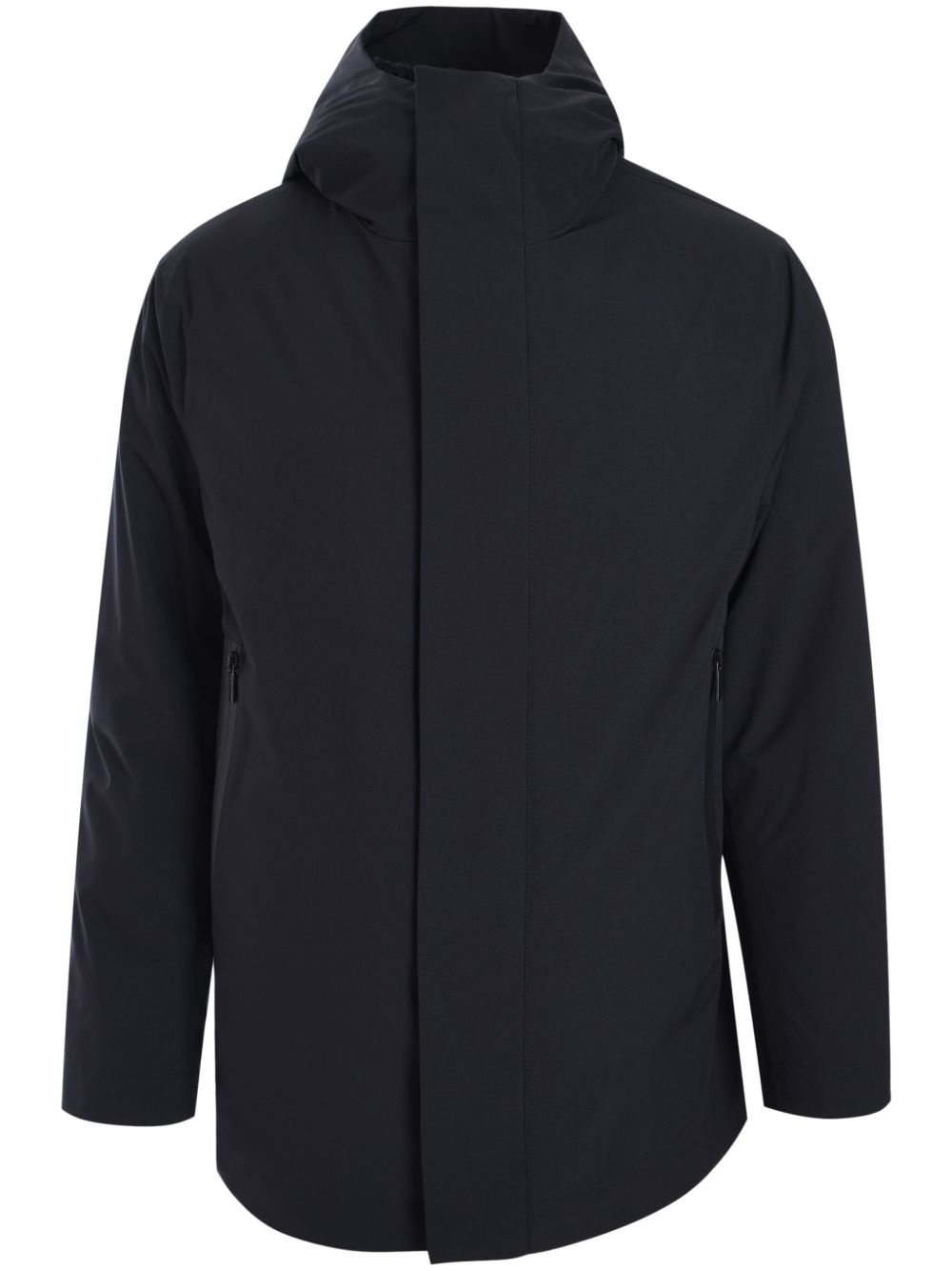 Heavy jacket Highlights - Navy blue - Concealed front fastening - Two side zip-fastening pockets - Funnel neck - Classic hood Imported Composition Polyester 95%, Elastane 5%