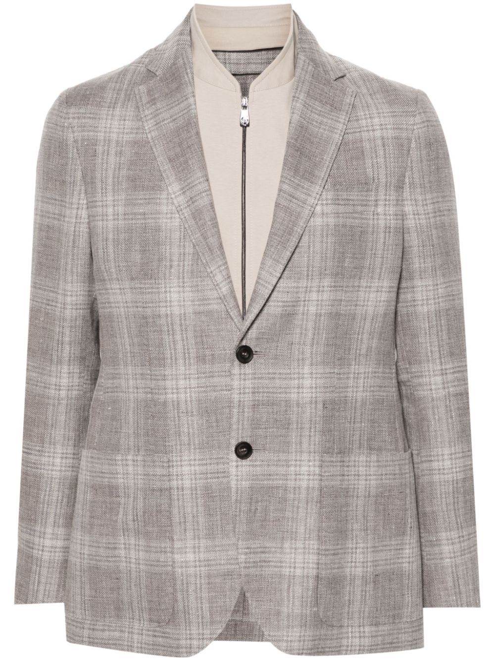 layered single-breasted blazer Highlights - Beige - Cotton blend - Interlock twill weave - Check pattern - Layered design - Notched lapels - Front button and zip fastening - Long sleeves - Buttoned cuffs - Chest welt pocket - Two front patch pockets - English rear vents - Straight hem - Unlined Made in Italy Composition Polyester 100%, Cotton 56%, Polyamide 37%, Elastane 7% SIZE & FIT Model measurements Height 6 ft 2 in(1.87 m) Bust/Chest 36.22 in(92 cm) Hips 37 in(94 cm) Waist 27.95 in(71 cm) FittingInformation Designed for a slim fit, offering a comfortable fit that sits just away from the body The detachable panel offers the preference for a different fit Made from a midweight fabric This piece fits true to size – take your usual size