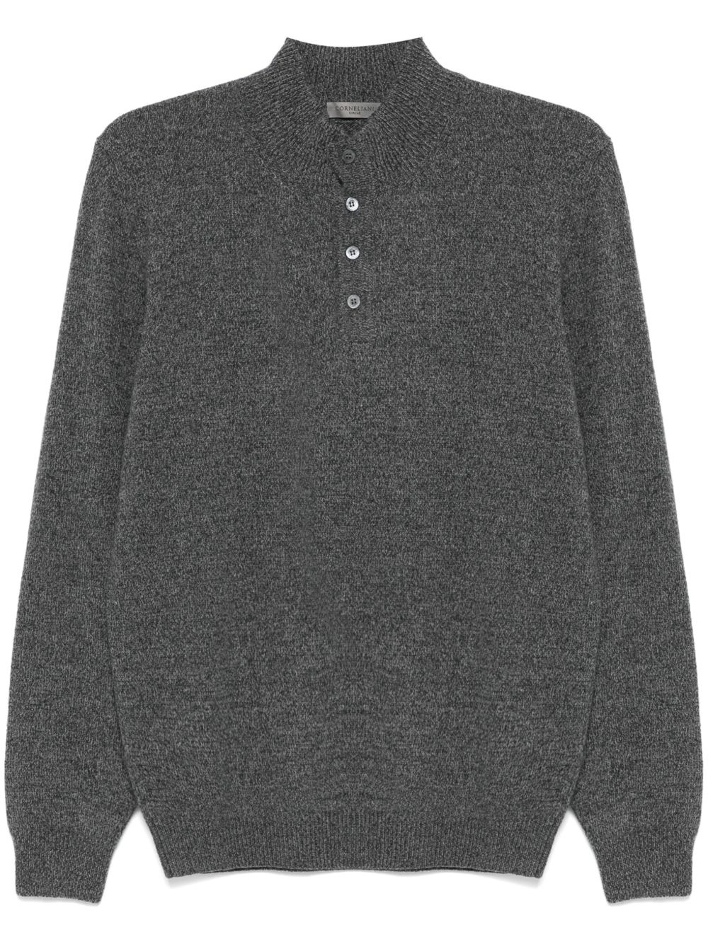 melange sweater Highlights - Anthracite grey - Cashmere-wool blend - Knitted construction - Melange effect - Front button placket - Mock neck - Long sleeves - Ribbed cuffs and hem Made In Italy Composition Cashmere 97%, Wool 3% SIZE & FIT Model measurements Height 6 ft 0 in(1.84 m) Bust/Chest 35.82 in(91 cm) Hips 37 in(94 cm) Waist 28.34 in(72 cm) FittingInformation Designed for a relaxed fit, this piece allows for comfort and movement when worn The ribbed hem offers a close, comfortable fit Made with a midweight knit, this piece offers some stretch