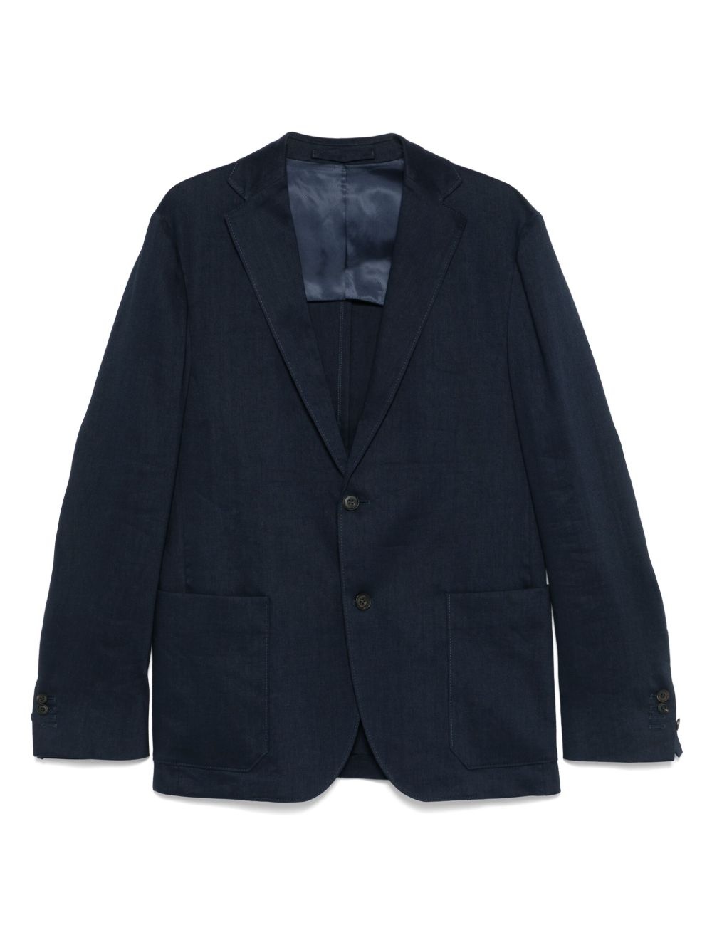 single-breasted blazer Highlights - Navy blue - Front button fastening - Two side patch pockets - Buttoned-cuff sleeves - Italian rear vents Made in Italy Composition Lining: Viscose 100% Outer: Linen/Flax 52%, Virgin Wool 33%, Mohair 15% SIZE & FIT Model measurements Height 6 ft 2 in(1.87 m) Bust/Chest 36.22 in(92 cm) Hips 37.79 in(96 cm) Waist 29.13 in(74 cm) FittingInformation Designed for a slim fit, offering a comfortable fit that sits just away from the body The vented hem offers movement at the rear Made from a midweight non-stretch fabric, this piece offers minimal elasticity when worn