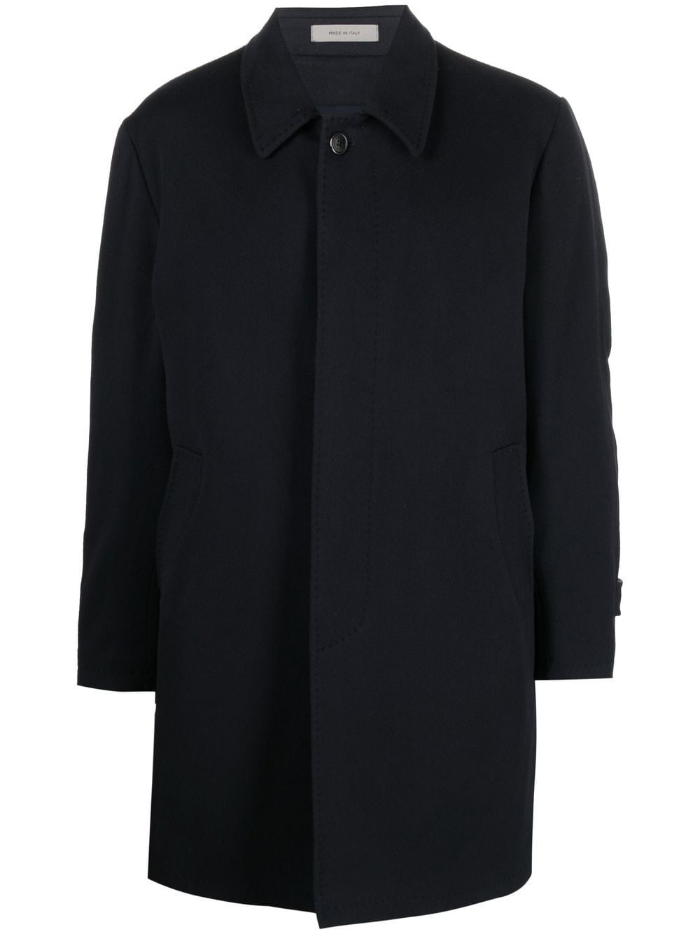 single-breasted coat Highlights - Dark blue - Wool - Classic collar - Concealed front fastening - Long sleeves - Two side inset pockets - Mid-length Made in Italy Composition Lining: Polyester 100% Outer: Wool 100% SIZE & FIT Model measurements Height 6 ft 2 in(1.89 m) Bust/Chest 37.79 in(96 cm) Hips 37 in(94 cm) Waist 29.92 in(76 cm) FittingInformation This piece fits true to size. We recommend you get your regular size Cut for a loose fit Made with a mid-weight non-stretch fabric Washing instructions Dry Clean Only
