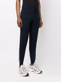 slim-cut track pants navy blue cotton blend side stripe detailing slim cut mid-rise elasticated drawstring waistband rear jetted pocket elasticated ankles Imported Composition Cotton 50%, Polyester 50% SIZE & FIT Model measurements Height 6 ft 2 in(1.89 m) Bust/Chest 35.43 in(90 cm) Hips 36.61 in(93 cm) Waist 28.74 in(73 cm) FittingInformation This piece fits true to size. We recommend you get your regular size Cut for a slim fit Made with a mid-weight fabric Washing instructions Hand Wash