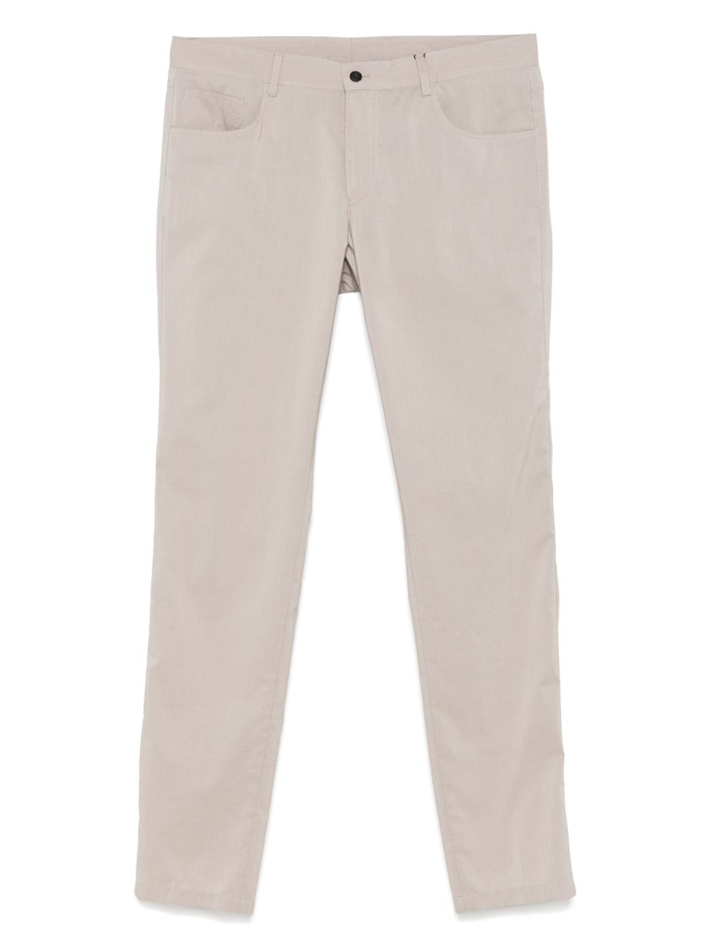 straight-leg trousers Highlights - Beige - Front button and zip fastening - Classic five pockets - Belt loops Imported Composition Outer: Cotton 53%, Silk 35%, Polyamide 10%, Elastane 2% Lining: Polyester 65%, Cotton 35% SIZE & FIT Model measurements Height 6 ft 2 in(1.88 m) Bust/Chest 37.4 in(95 cm) Hips 38.58 in(98 cm) Waist 31.1 in(79 cm) FittingInformation Designed for a slim tapered leg, offering a close fit that sits just away from the leg with a closer fit towards the ankle Made from a midweight non-stretch fabric Washing instructions Dry Clean Only