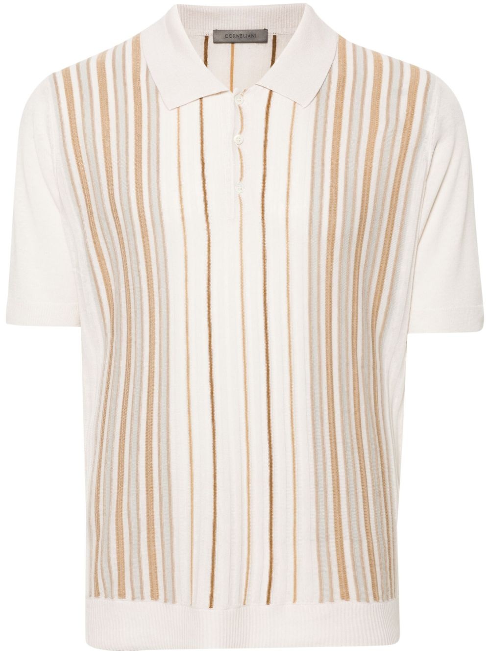 striped polo shirt Highlights - Cream white - Linen-silk blend - Knitted construction - Vertical stripe pattern - Polo collar - Short sleeves - Ribbed cuffs and hem - Straight hem - Short front button fastening Made in Italy Composition Silk 55%, Linen/Flax 45% SIZE & FIT Model measurements Height 6 ft 2 in(1.87 m) Bust/Chest 36.41 in(92.5 cm) Hips 37 in(94 cm) Waist 29.52 in(75 cm) FittingInformation Designed for a slim fit, this polo shirt offers a comfortable fit that sits just away from the body The ribbed hem offers a close, comfortable fit Made with a midweight knit, this piece offers some stretch This piece fits true to size – take your usual size