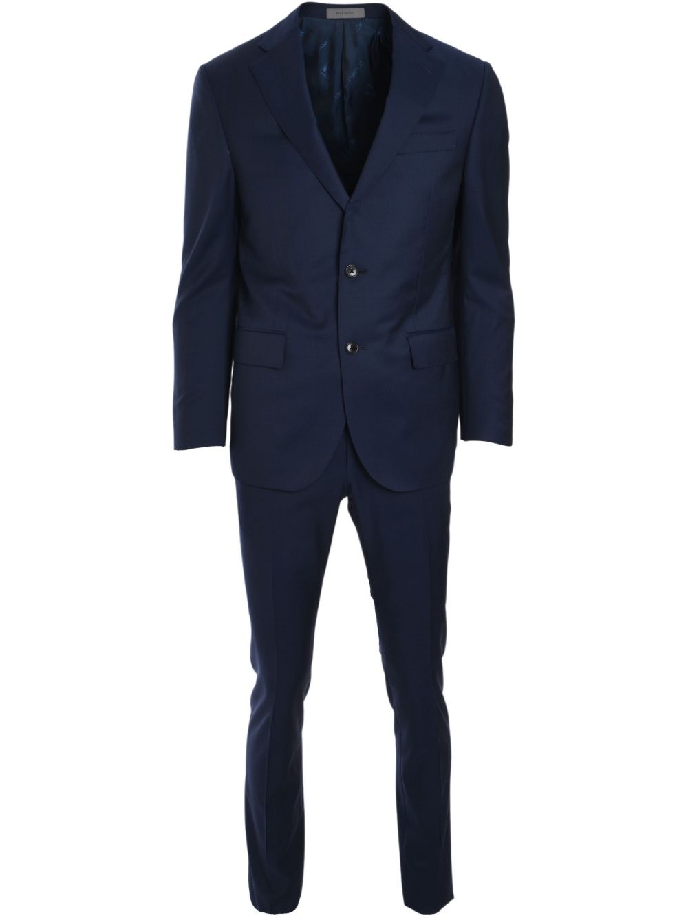 virgin wool suit Highlights - Navy blue - Front button fastening - Concealed front fastening - Two side slit pockets - Two rear button-fastening jetted pockets Made in Italy Composition Virgin Wool 100% Washing instructions Read Manufacturer Guidelines