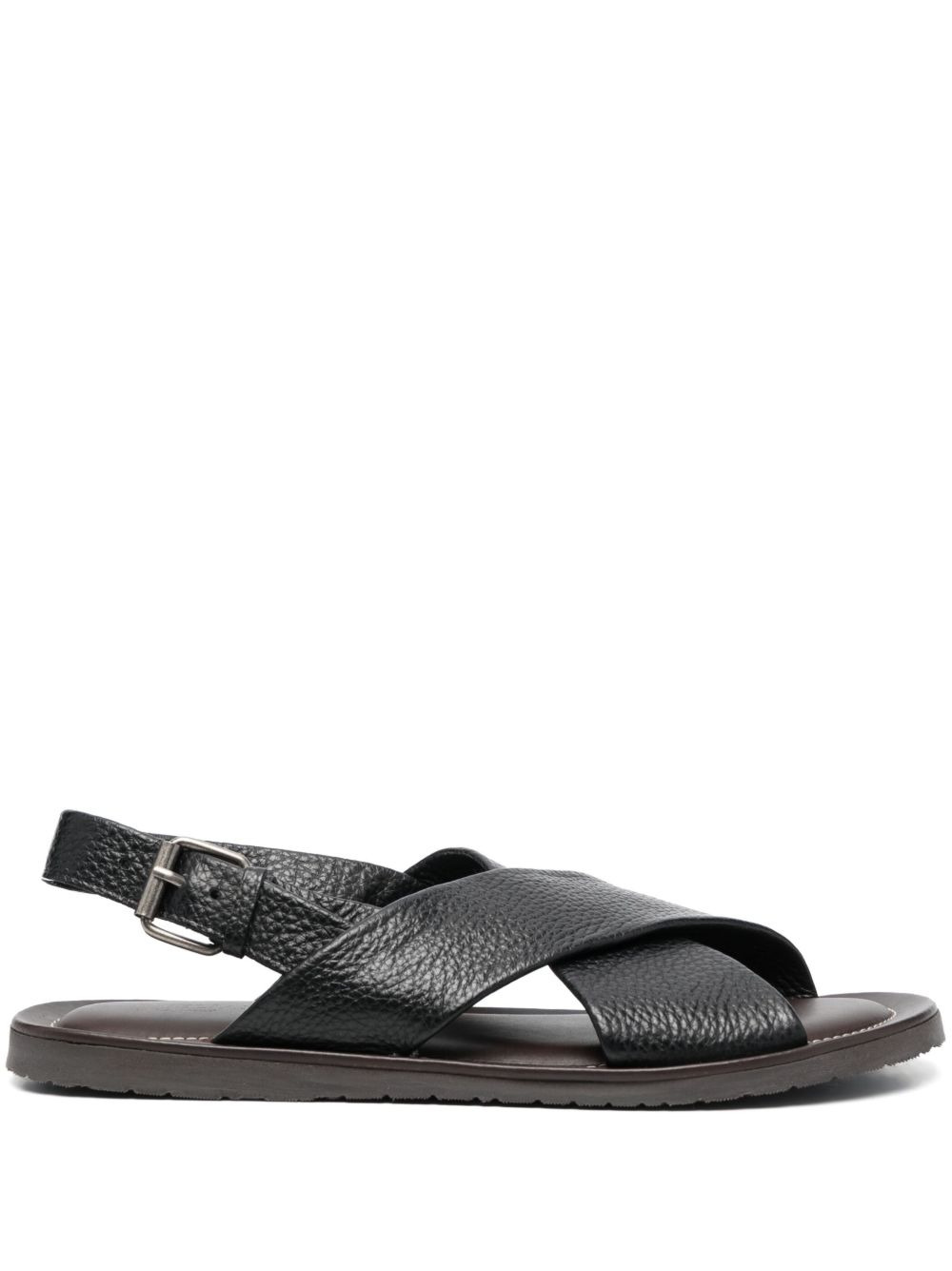 Waikiki Beach leather sandals black calf leather grained texture crossover strap at the toe open toe buckle-fastening ankle strap flat rubber sole Made in Italy Composition Lining: Calf Leather 100% Outer: Calf Leather 100% Sole: Rubber 100% SIZE & FIT Measurement HEEL 0.59 in(1.5 cm) Sole height 0.39 in(1 cm)