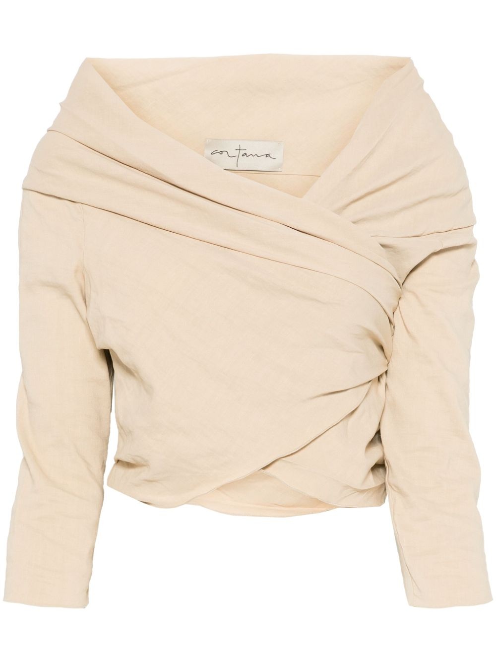 Mite top Highlights - Beige - Concealed side zip fastening - Off-shoulder - Three-quarter length sleeves - Draped design Imported Composition Hemp 53%, Viscose 44%, Elastane 3% SIZE & FIT Model measurements Height 5 ft 10 in(1.78 m) Bust/Chest 33.46 in(85 cm) Hips 36.22 in(92 cm) Waist 23.22 in(59 cm) FittingInformation Designed for a slim fit that sits just away from the body offering a close yet comfortable fit Cropped in length Made from a midweight stretch fabric, this piece offers elasticity and flexibility when worn Washing instructions Dry Clean Only
