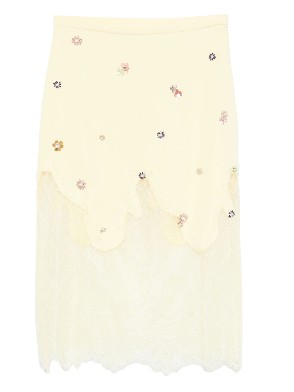 crepe cady midi skirt Highlights - Pastel yellow - Concealed side hook and zip fastening - Rhinestone embellishment - Lace panels - Scallop hem Imported Composition Polyester 100%, Polyamide 100% SIZE & FIT Model measurements Height 5 ft 10 in(1.78 m) Bust/Chest 31.49 in(80 cm) Hips 37 in(94 cm) Waist 23.62 in(60 cm) FittingInformation This midi-length skirt is intended to be worn high on the waist The elasticated waist allows for a comfortable fit Made from a midweight non-stretch fabric