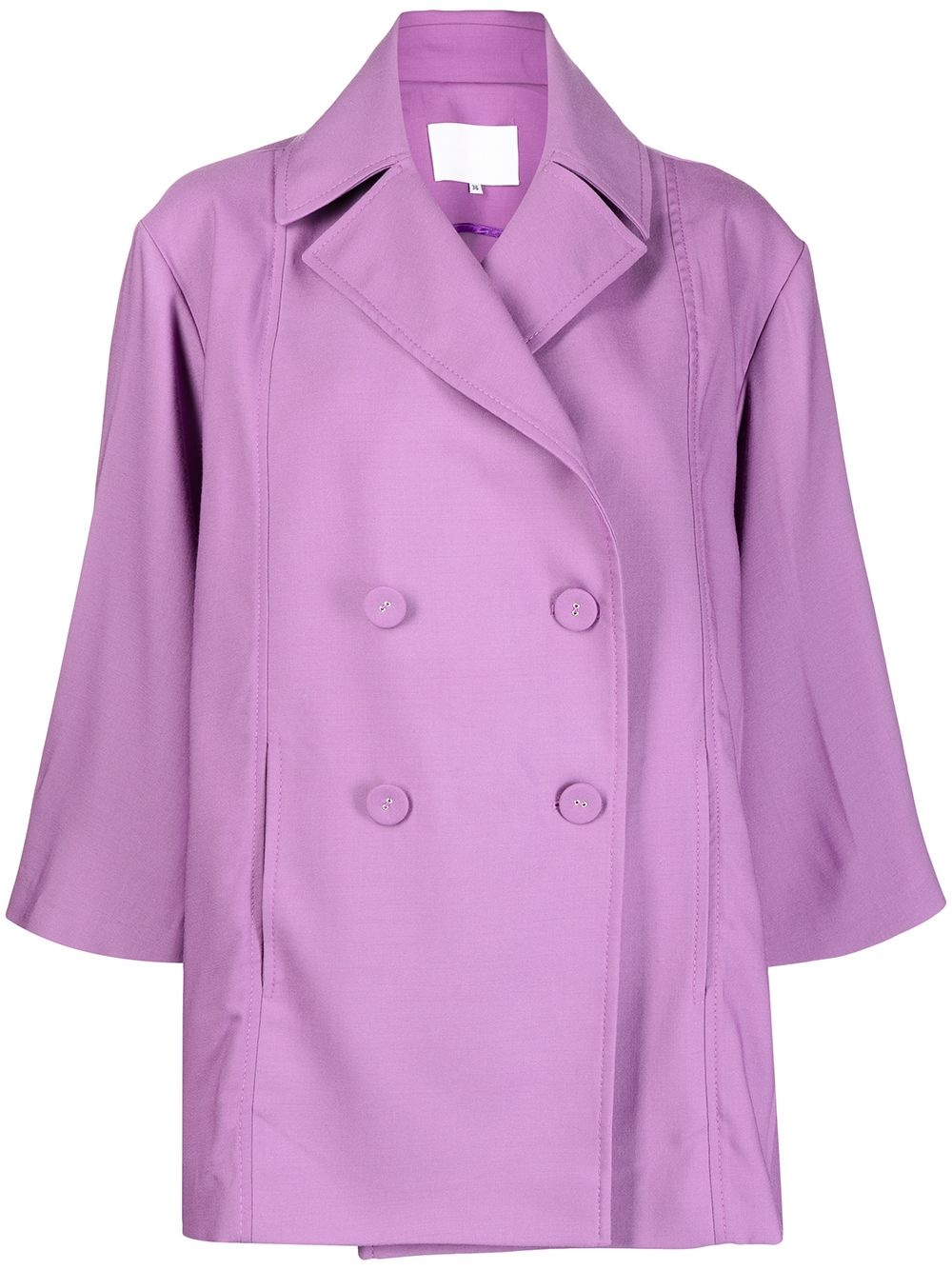 double-breasted fitted blazer lilac wool blend double-breasted button fastening classic lapels long sleeves Imported Composition Wool 97%, Elastane 3% SIZE & FIT Model measurements Height 5 ft 10 in(1.78 m) Bust/Chest 28.34 in(72 cm) Hips 35.43 in(90 cm) Waist 23.62 in(60 cm) FittingInformation This piece fits true to size. We recommend you get your regular size Cut for an oversized fit Made with a mid-weight stretch fabric Washing instructions Dry Clean Only