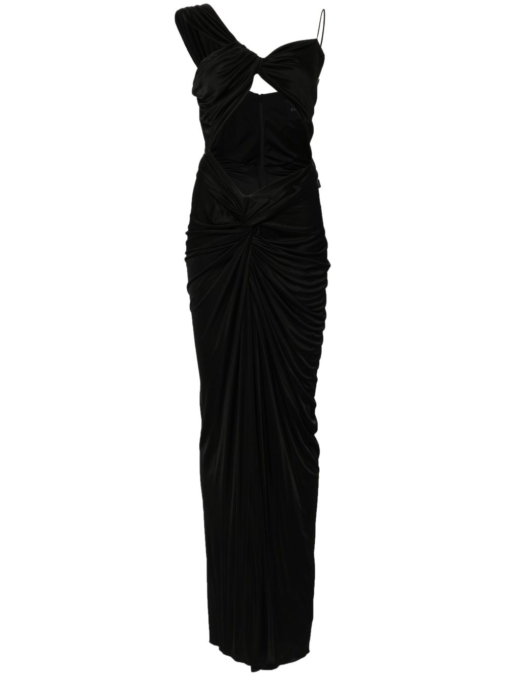 glossy jersey gown Highlights - Black - Jersey texture - Glossy finish - Concealed rear hook and zip fastening - Asymmetric neck - Sleeveless - Single shoulder strap - Cut-out detailing - Draped detailing - Knot detailing - Thigh-high side slit - Open back Imported Composition Rayon 100% SIZE & FIT Model measurements Height 5 ft 10 in(1.77 m) Bust/Chest 27.95 in(71 cm) Hips 34.64 in(88 cm) Waist 22.83 in(58 cm) FittingInformation Designed for a slim fit that sits just away from the body offering a close yet comfortable fit Made from a midweight non-stretch fabric, this piece offers minimal elasticity when worn