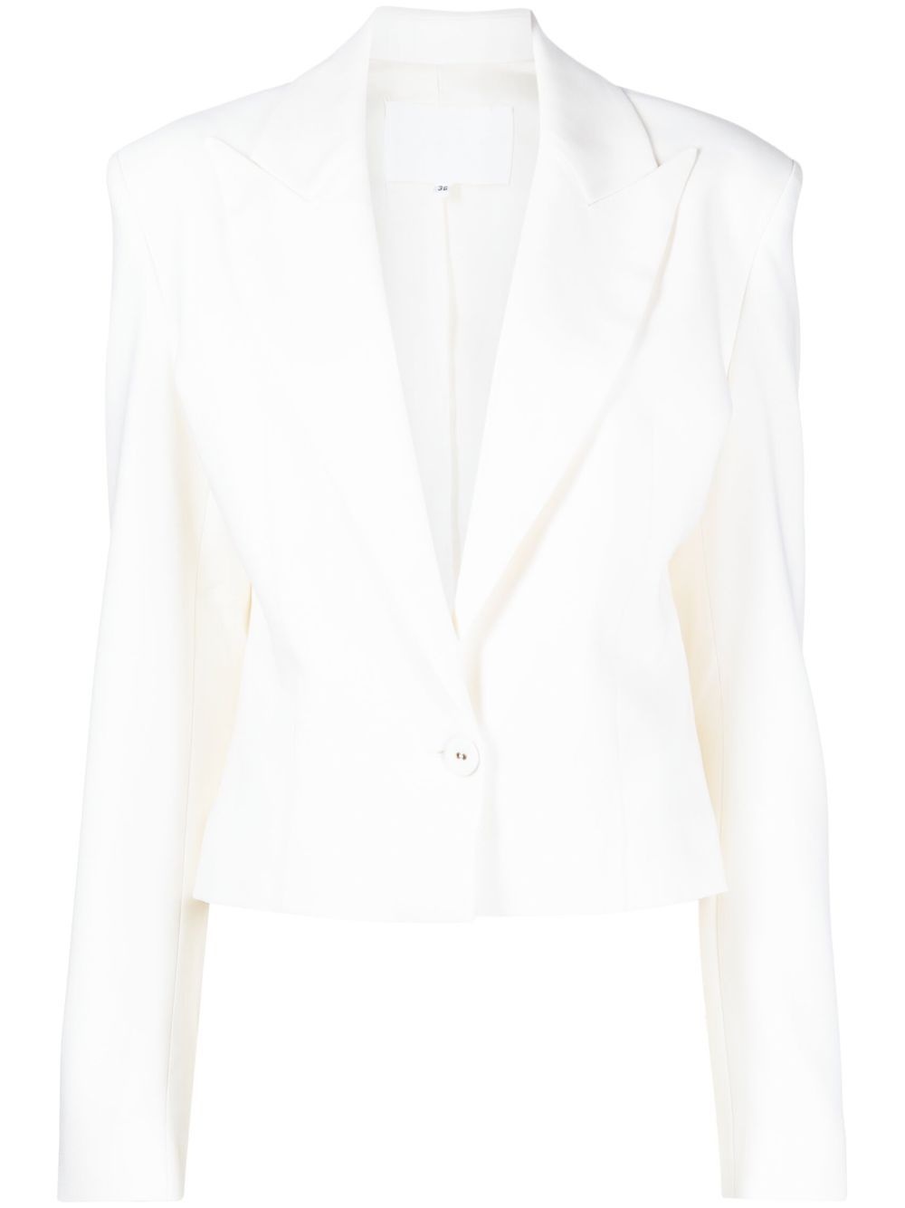 single-breasted cropped blazer ecru wool blend wide peak lapels button fastening cropped long sleeves buttoned cuffs Imported Composition Body: Wool 97%, Elastane 3% Lining: Acetate 100% SIZE & FIT Model measurements Height 5 ft 10 in(1.78 m) Bust/Chest 33.07 in(84 cm) Hips 33.85 in(86 cm) Waist 25.19 in(64 cm) FittingInformation This piece fits true to size. We recommend you get your regular size Cut for a loose fit Made with a mid-weight stretch fabric