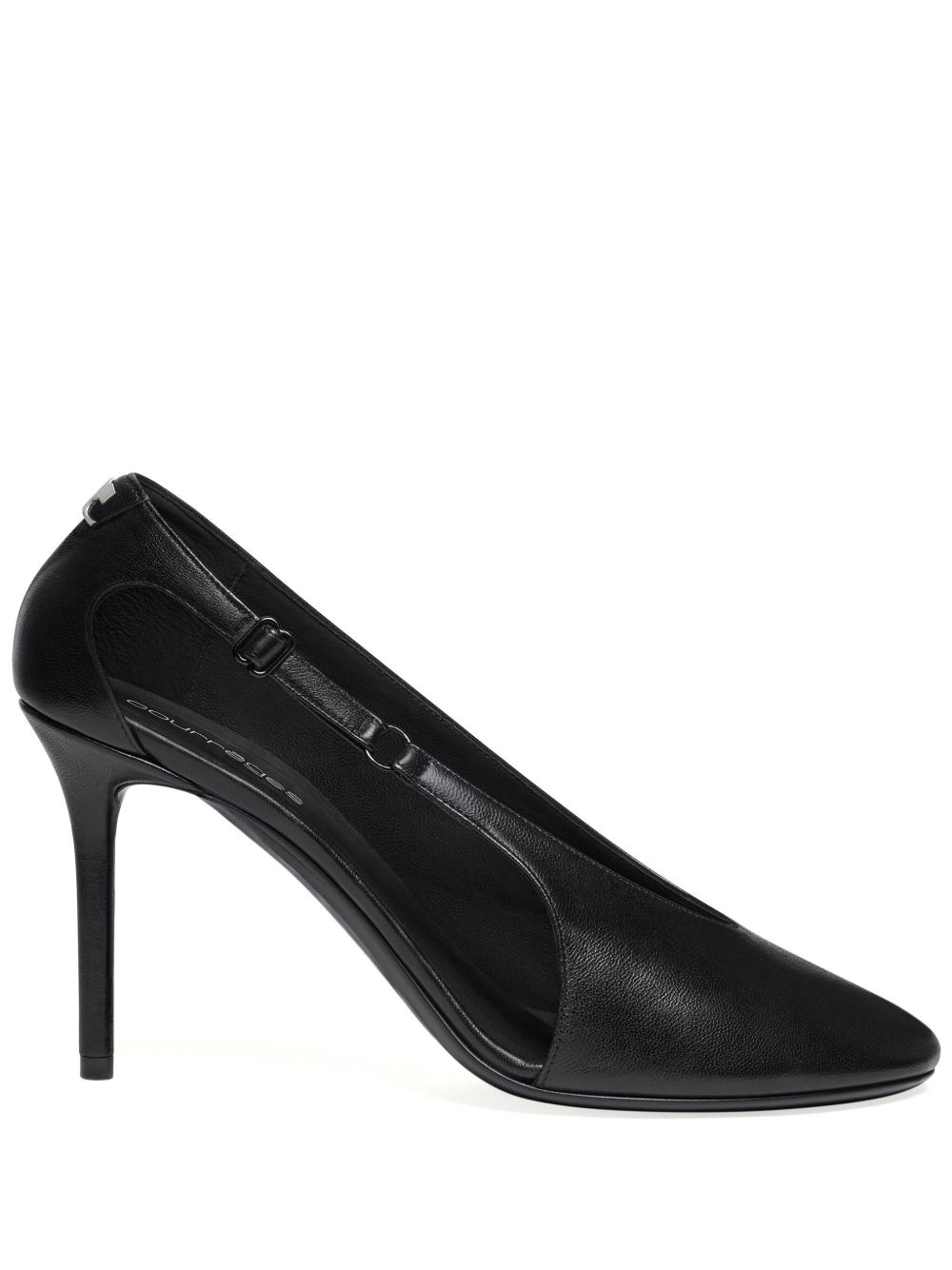 100mm Oblique leather pumps Highlights - Black - Lambskin - Smooth grain - Applique logo - Cut-out detailing - Adjustable strap to the side - Almond toe - Branded leather insole - High stiletto heel - Slip-on style Made in Italy Composition Outer: Lamb Skin 100% Lining: Calf Leather 100% Sole: Calf Leather 100%