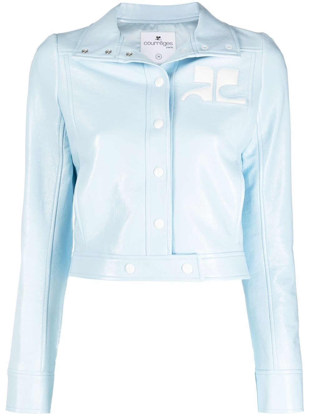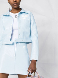 applique-logo cropped vinyl jacket pastel blue cotton blend applique logo spread collar front button fastening long sleeves buttoned cuffs straight hem cropped Imported Composition Outer: Cotton 88%, Polyurethane 10%, Spandex/Elastane 2% Lining: Cupro 100% SIZE & FIT Model measurements Height 5 ft 11 in(1.8 m) Bust/Chest 31.49 in(80 cm) Hips 36.61 in(93 cm) Waist 24.4 in(62 cm) FittingInformation Designed for a slim fit that sits just away from the body offering a close yet comfortable fit Made from a midweight fabric