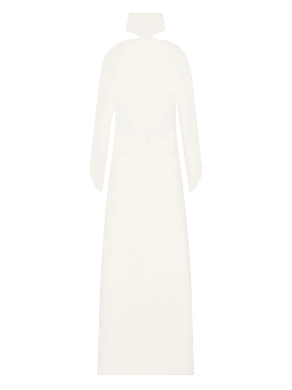 asymmetric shoulder-detail dress Highlights - White - High neckline - Long sleeves - Open shoulder design - Floor-length silhouette Made in Italy Composition Outer: Polyester 89%, Polyurethane 11% Washing instructions Read Manufacturer Guidelines