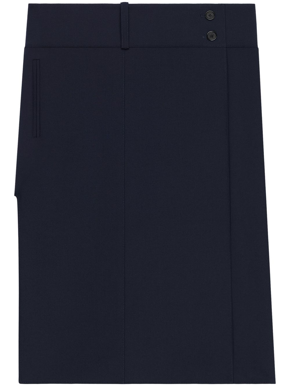 belted slit skirt Highlights - Navy blue - Side button fastening - Belt loops - Side welt pocket - Side slit Imported Composition Polyester 51%, Wool 41%, Fabric 8%