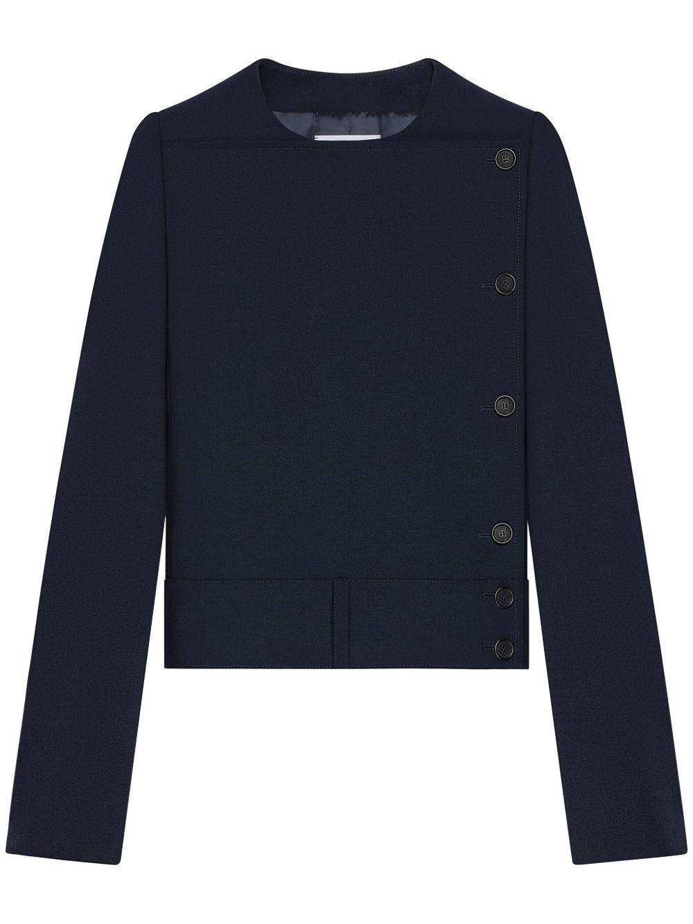 buttoned tailored jacket Highlights - Navy blue - Off-centre front fastening - Single loop - Cuff zips - Collarless Imported Composition Polyester 51%, Wool 41%, Fabric 8%